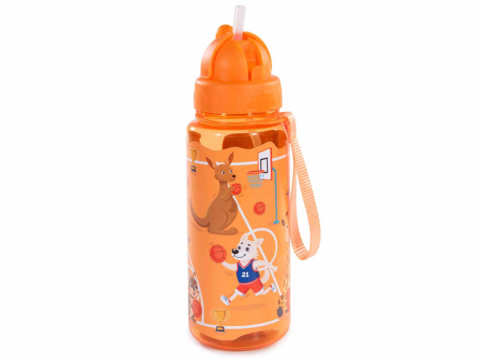 Botella de agua Tritan de 500 ml con temática de baloncesto naranja para niños con pajita y asa incorporadas