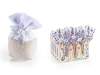 Cestas de madera con adornos de lavanda y bolsa de regalo de tela bicolor.