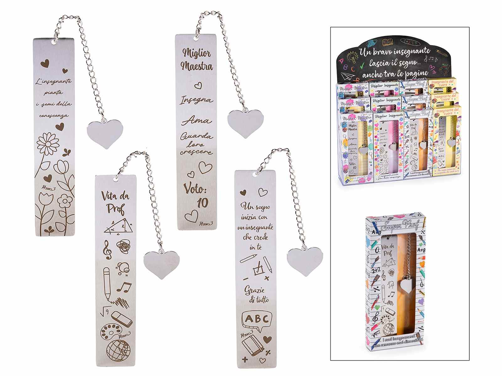 Marcapáginas metálico con texto de profesor y colgante de corazón, perfecto para regalar. Se presenta en un set de 12 unidades.