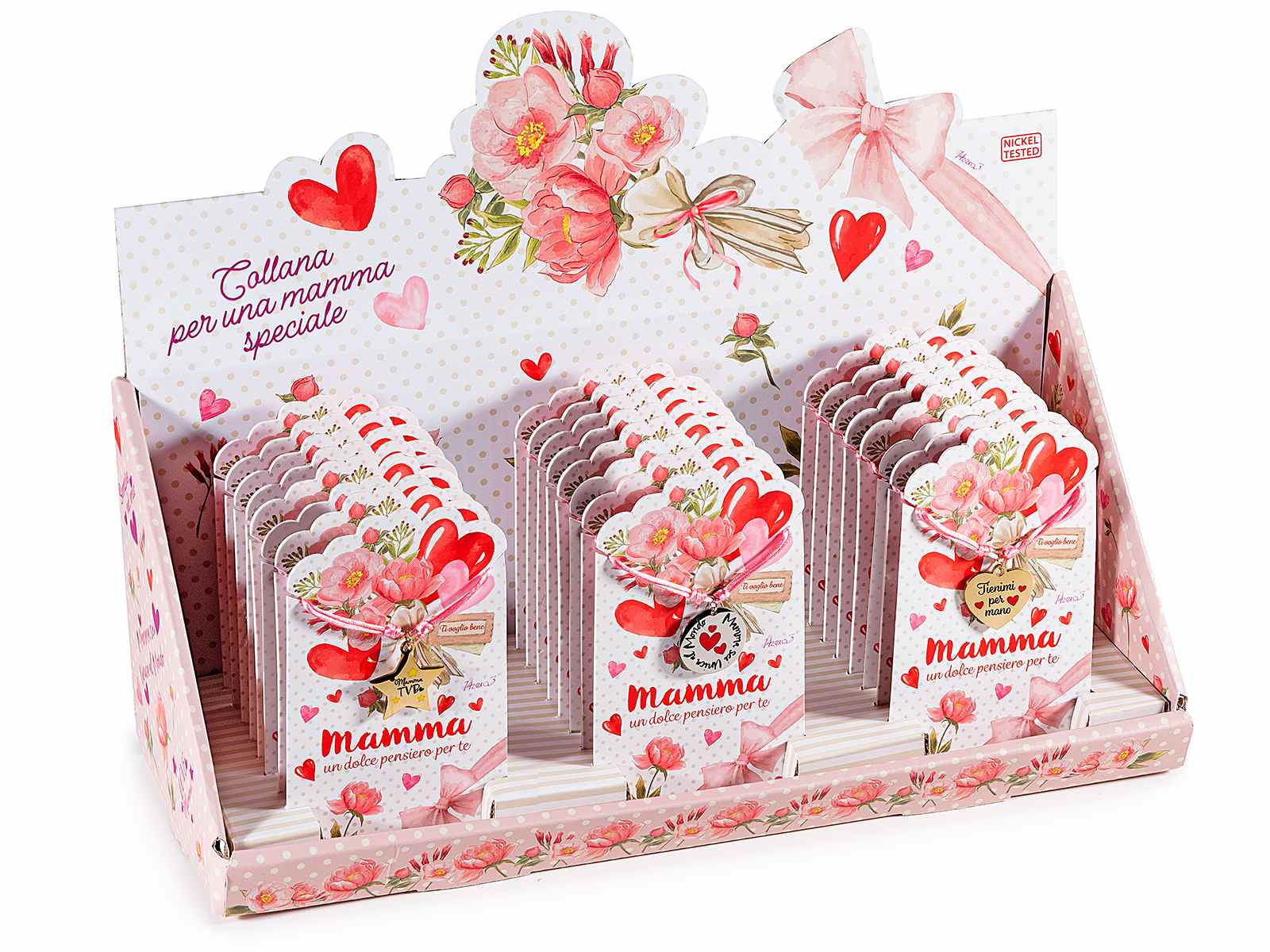 Collares de cuerda y charms de metal grabados y esmaltados con frases del Día de la Madre, en display de 24 piezas.