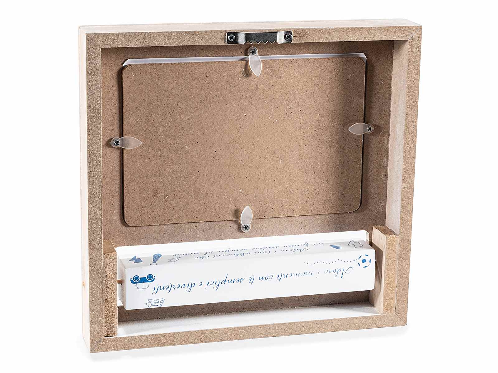 Marcos de fotos de madera con decoraciones del Día de la Madre y del Padre y un mensaje decorativo giratorio.