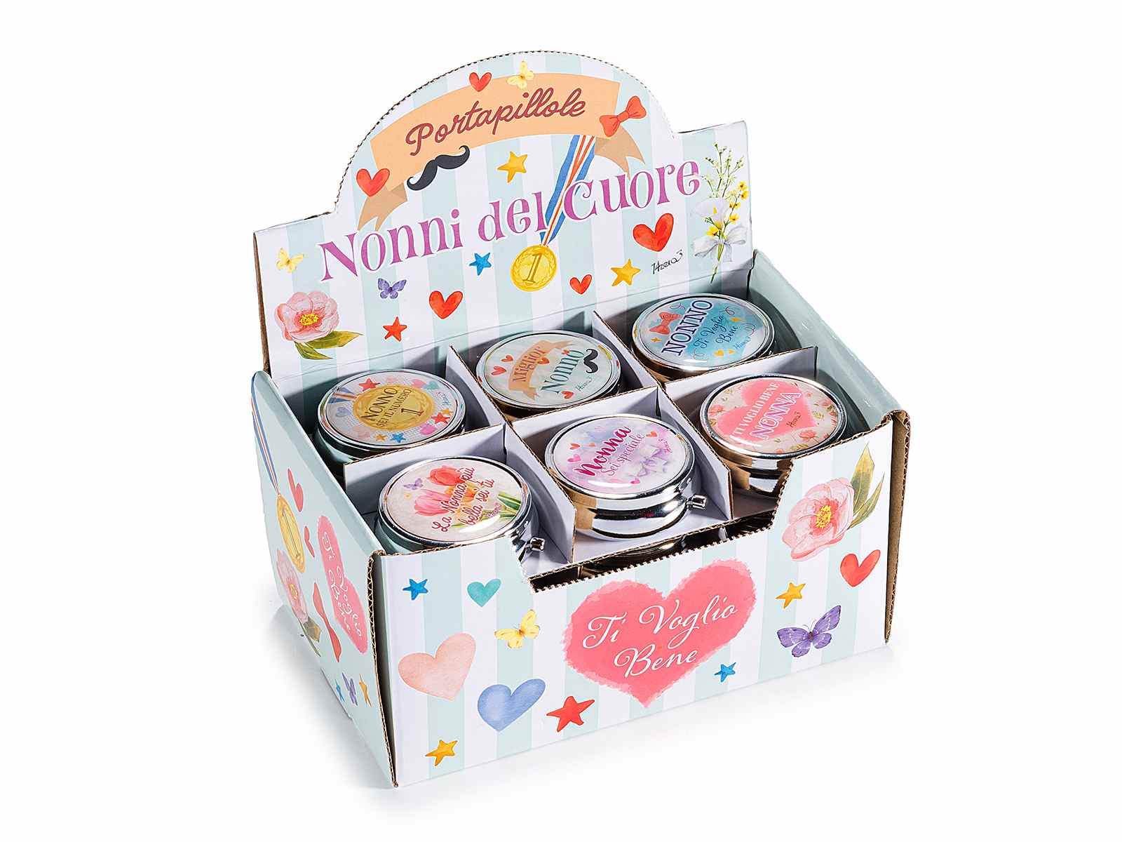 Pastilleros de metal y PP aptos para alimentos, con 3 compartimentos y decoración para el Día de los Abuelos. Se presentan en un set de 24 piezas.