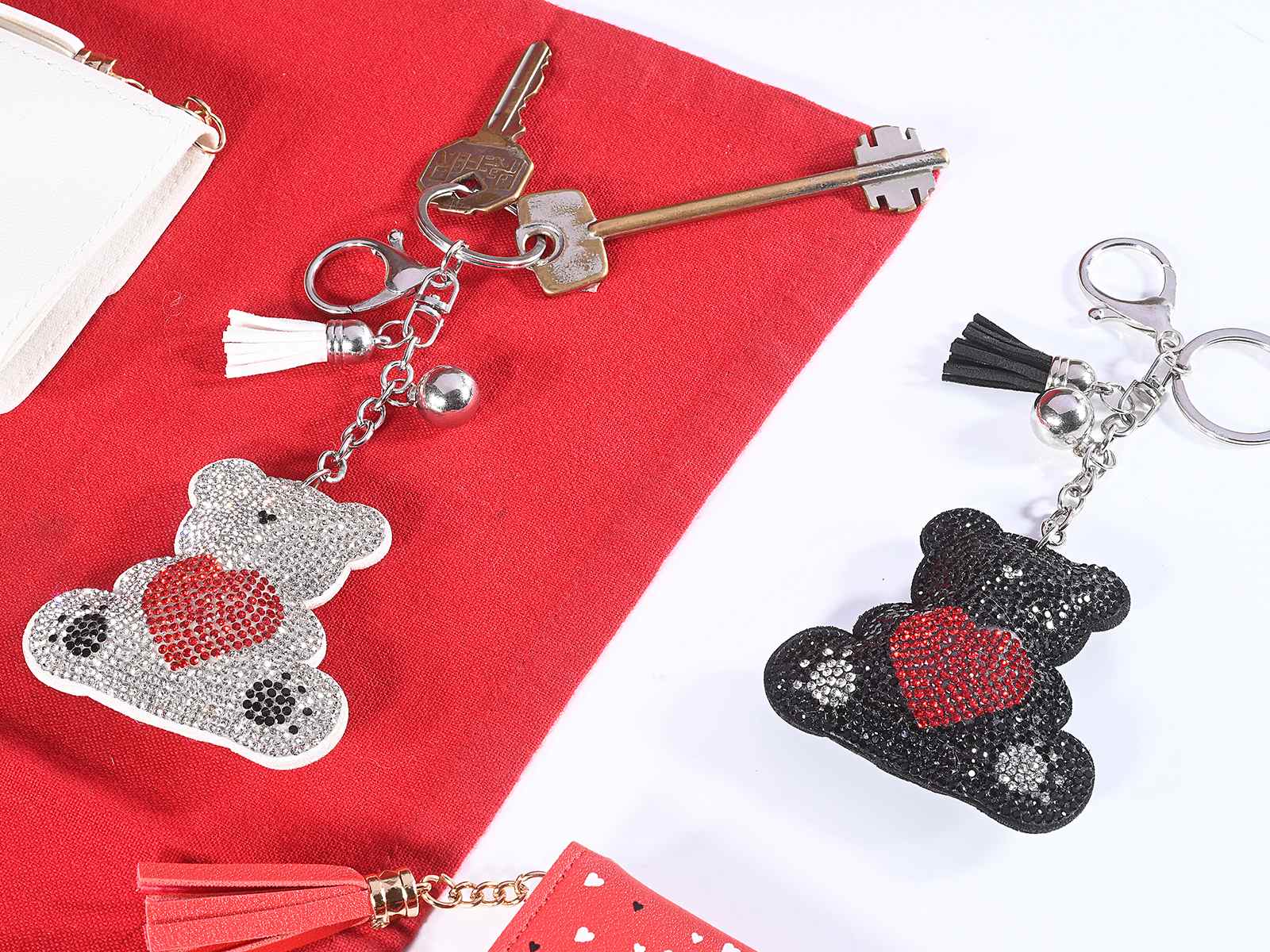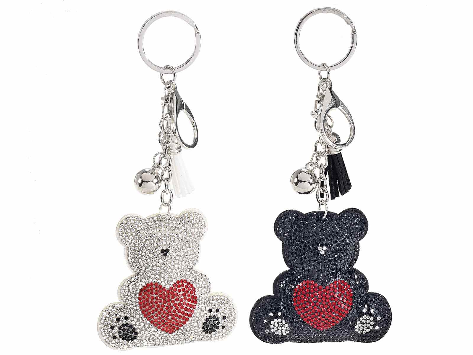 Llavero de osito de peluche con corazón en sus patitas, pedrería, borla y colgantes, ideal como regalo para San Valentín.
