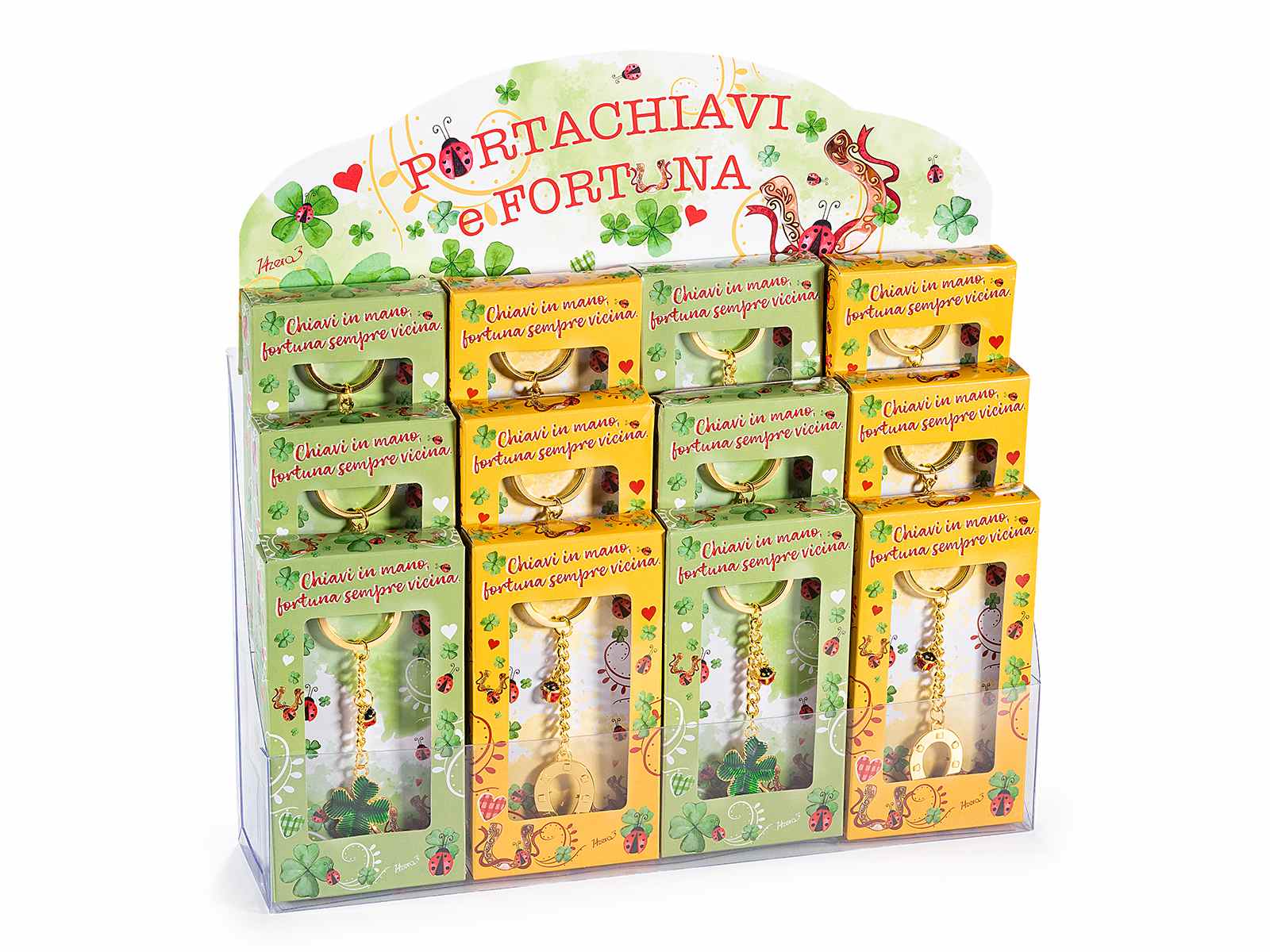 Llavero de metal con herradura y trébol de cuatro hojas con decoración de mariquita de la suerte en un expositor de 12 piezas