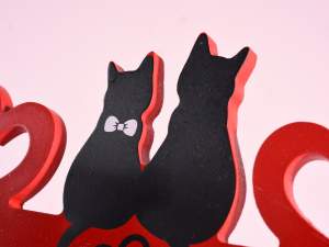 Portafotos de gato en madera de colores y adornos de corazones para colocar en la mesa