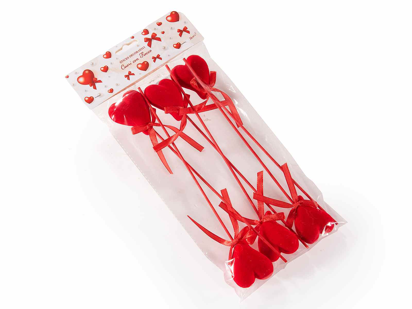 Corazones decorativos de poliestireno rojo en palitos con lazos en blíster de 6, perfectos para el Día de San Valentín y el Día de la Madre.