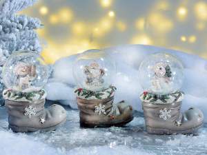 Bola de nieve navideña con Papá Noel, muñeco de nieve y reno con luces LED sobre una base de resina decorada. En vitrina de 12 piezas
