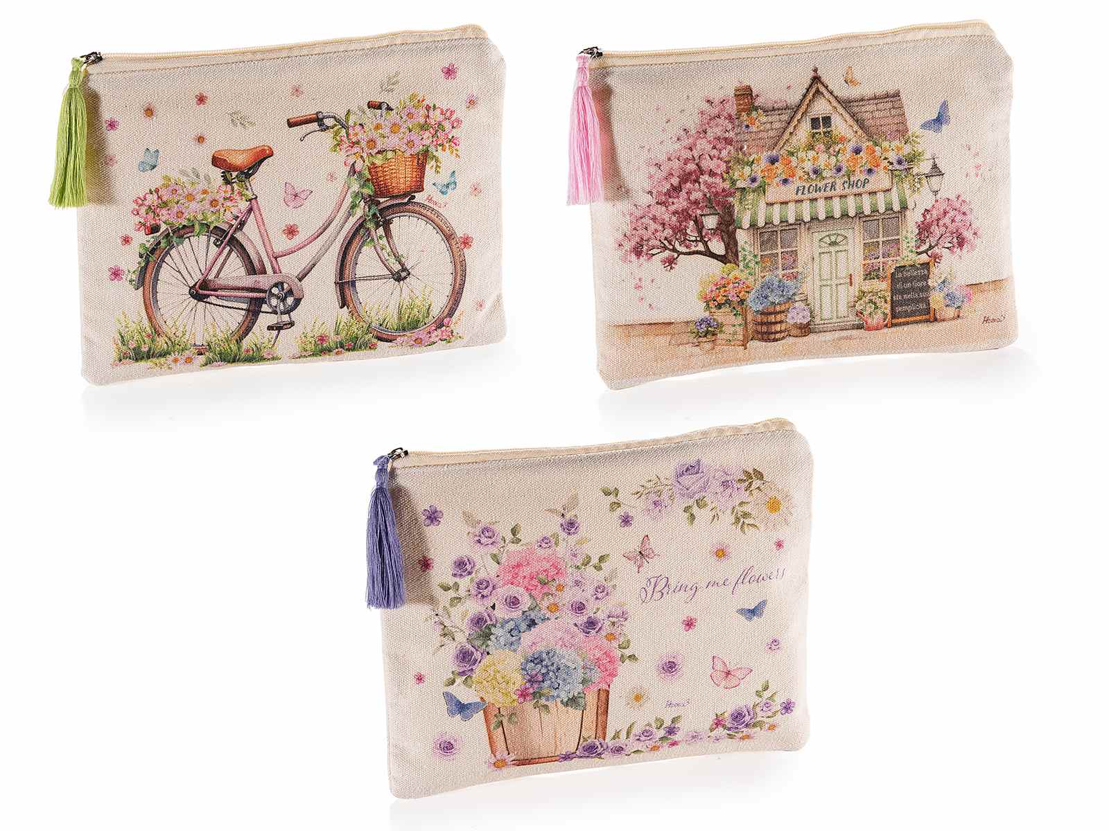 Estuches de lona con adornos primaverales, cremallera y borla.
