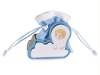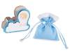 Adornos de madera para baby shower con temática de nacimiento, incluye una bolsita azul con cordón y un corazón decorativo. Se puede escribir en la etiqueta.
