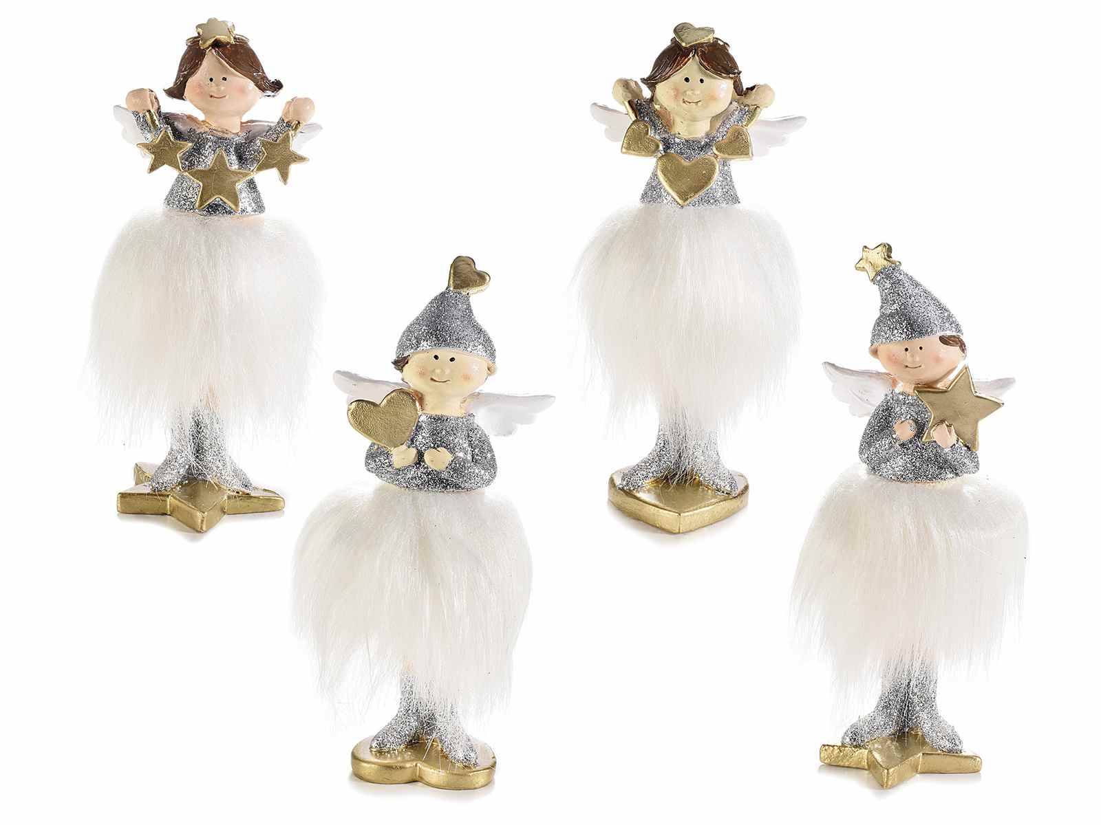 Ángeles de resina para colocar de pie con falda de piel ecológica y adornos dorados y brillantes
