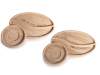 Bandejas de madera con platillo en forma de grano de café y dos compartimentos y escritura tallada.