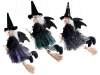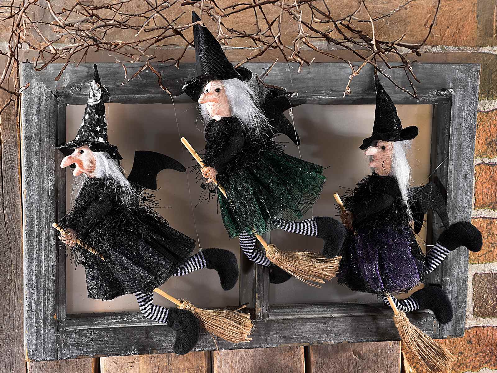 Brujas Befana volando para colgar con vestido de telaraña y escoba decorativa