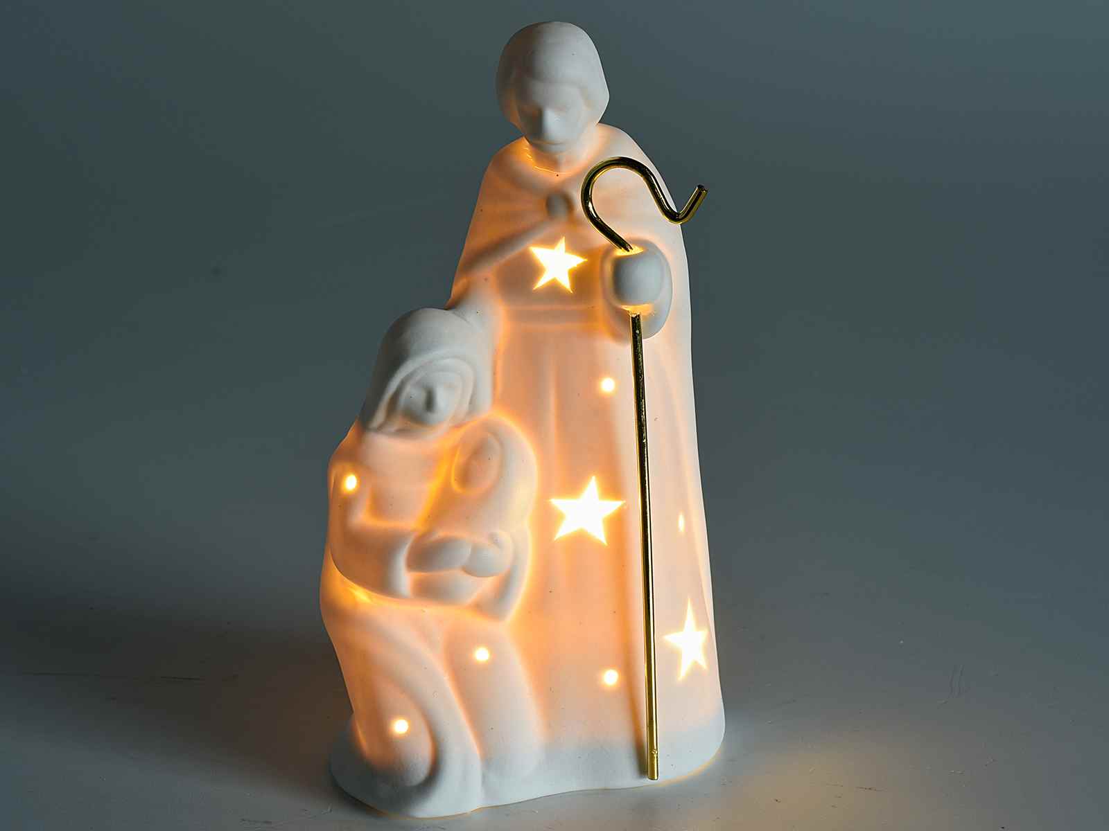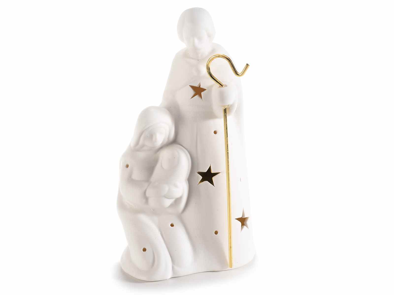 Belén Sagrada Familia en porcelana blanca con detalle dorado y luces LED