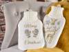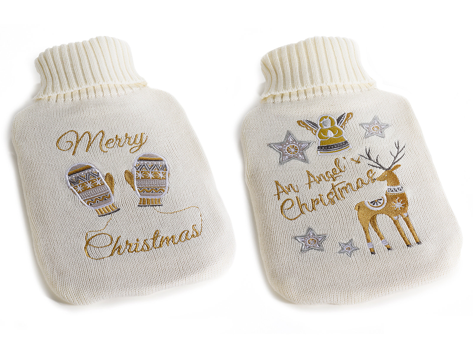 Bolsas de agua caliente navideñas con forro de punto y adornos navideños, empaquetadas individualmente.