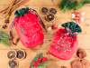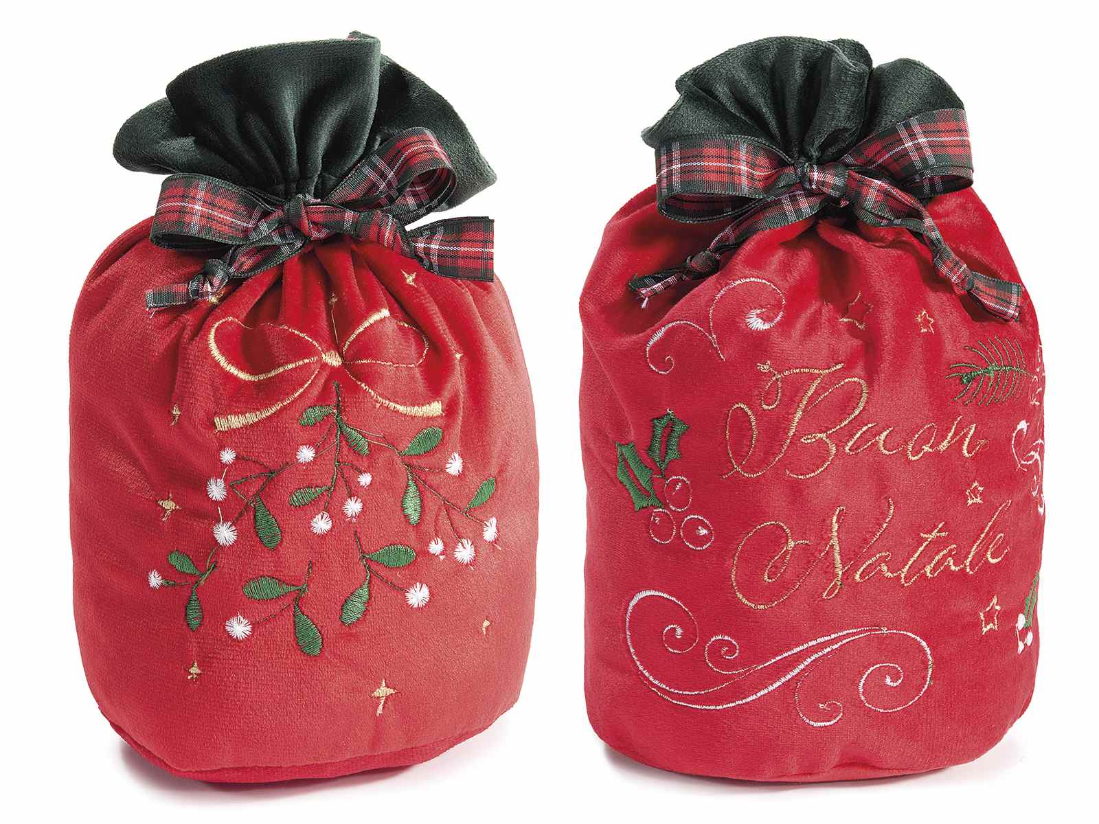 Bolsas navideñas de terciopelo para panettone, con adornos bordados y la palabra "Feliz Navidad" y cordón de tartán.