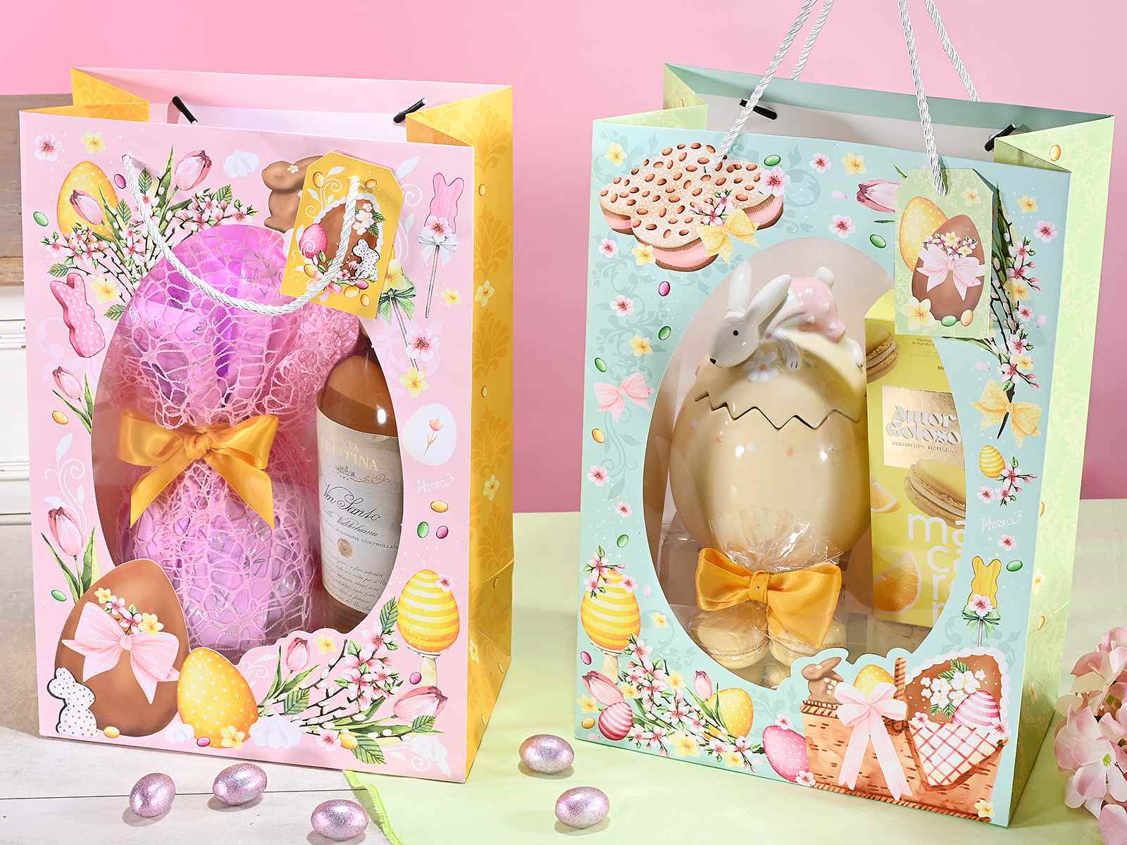 Bolsa de regalo de papel de Pascua con expositor en forma de huevo y etiqueta a juego.