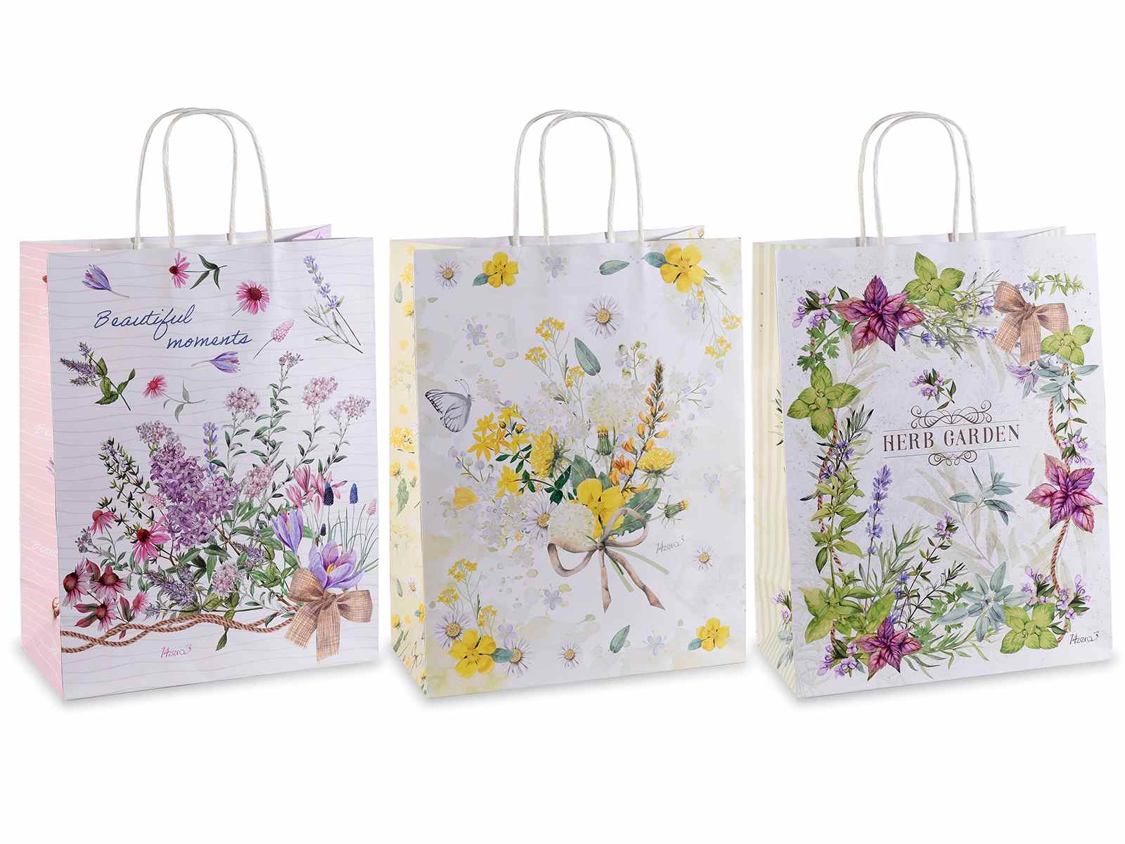 Bolsas de papel grandes para la compra con estampado de hierbas y flores.