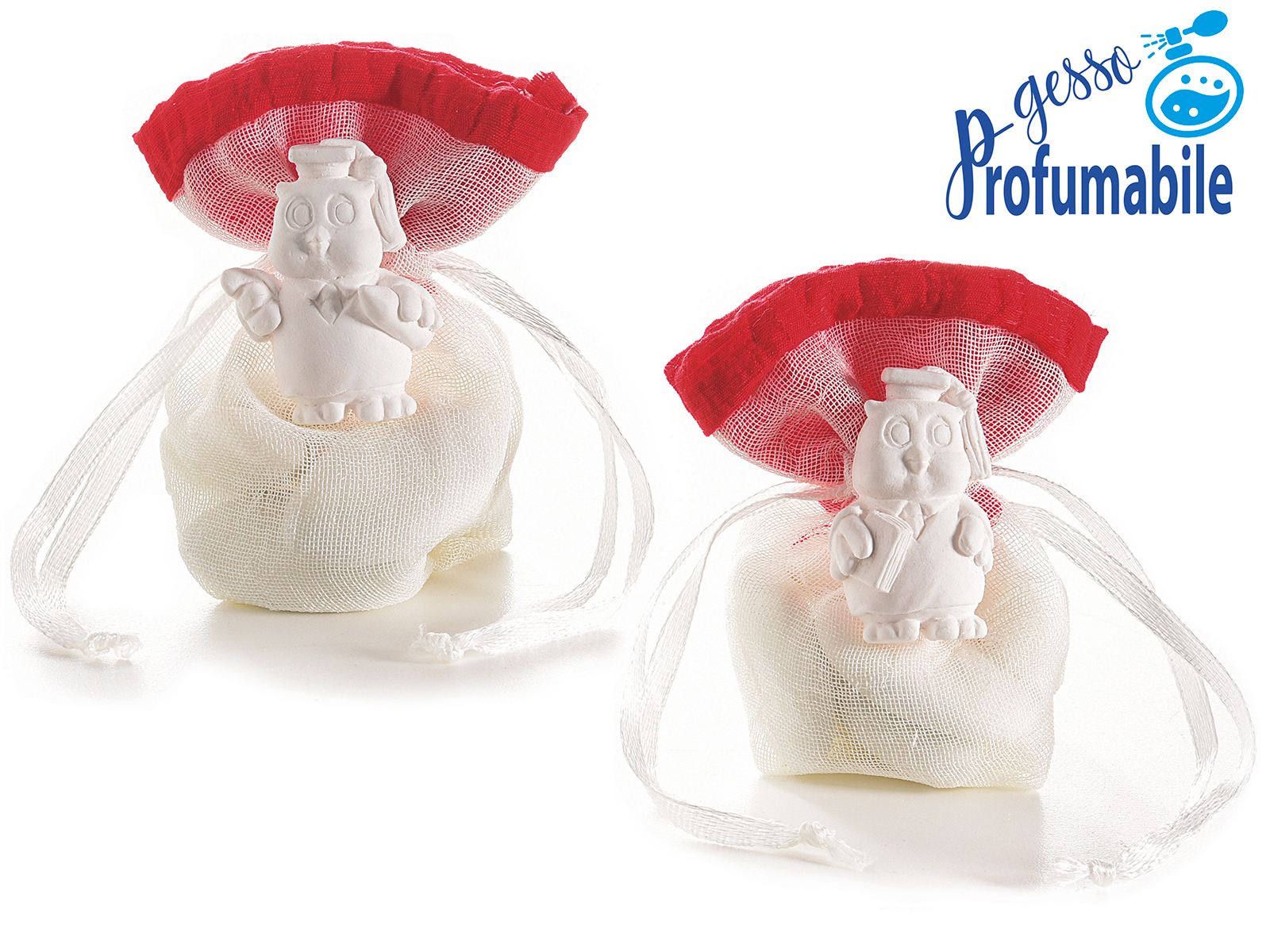 Bolsas de tela para recuerdos de graduación con búho de yeso perfumado y cierre de cordón.