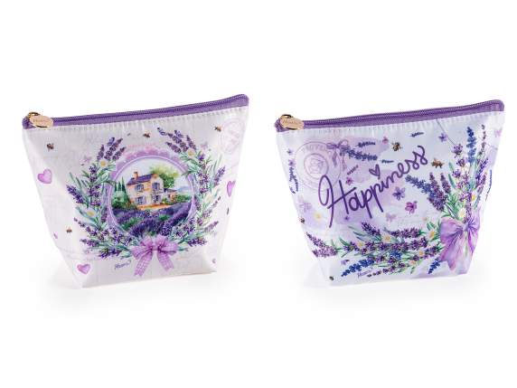 Bolsa de tela con cremallera y decoraciones de lavanda.