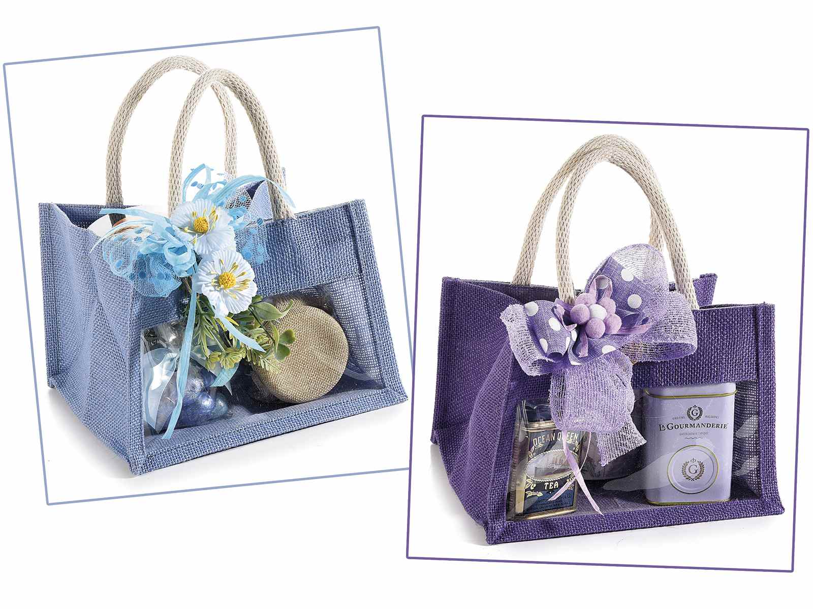 Bolsas de yute con ventana transparente, asas de cuerda y cierre de botón.