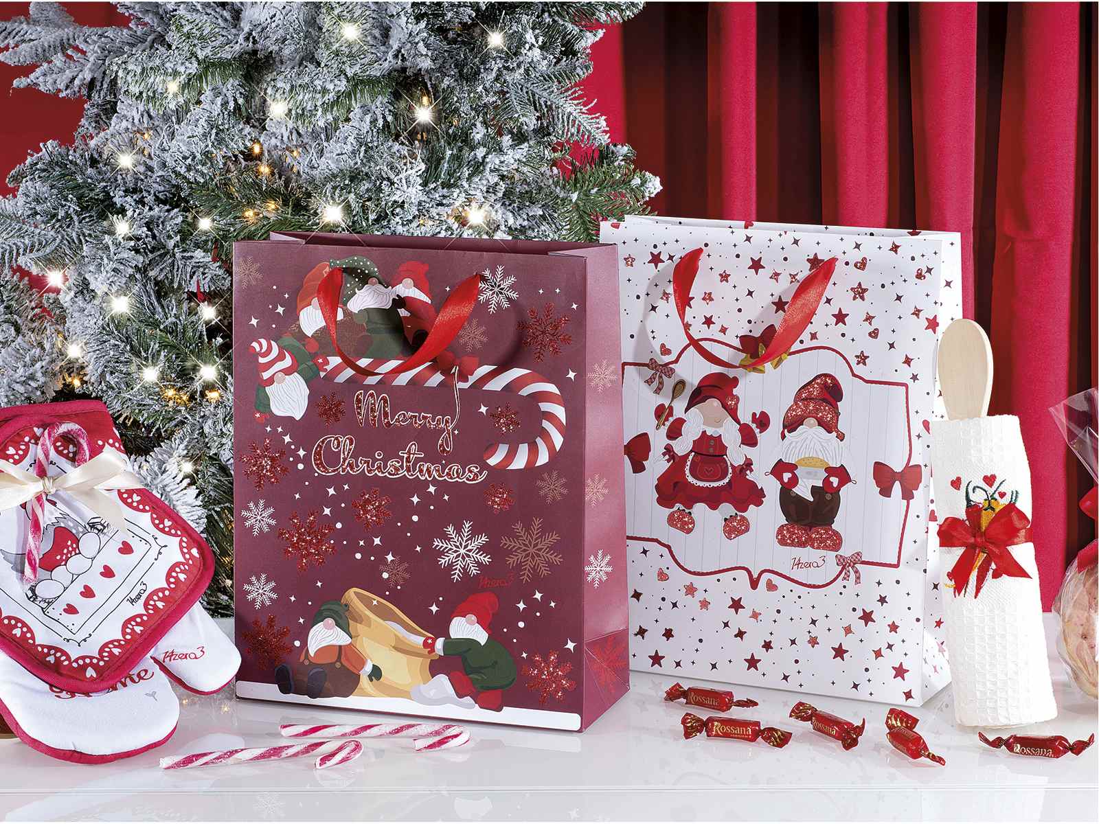 Bolsas/sobres navideños grandes de papel con estampado de gnomos navideños, adornos de purpurina y asas de satén.