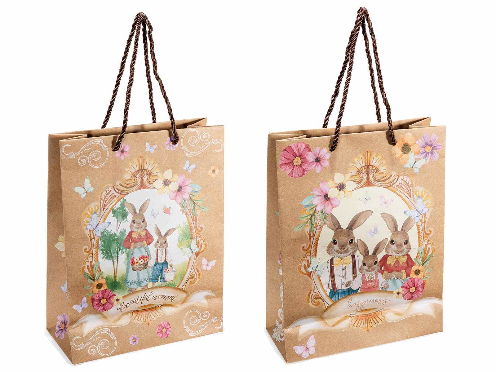 Bolsas/sobres/bolsas de papel kraft medianos con conejos de Pascua, estampado de flores y ventana transparente.