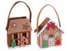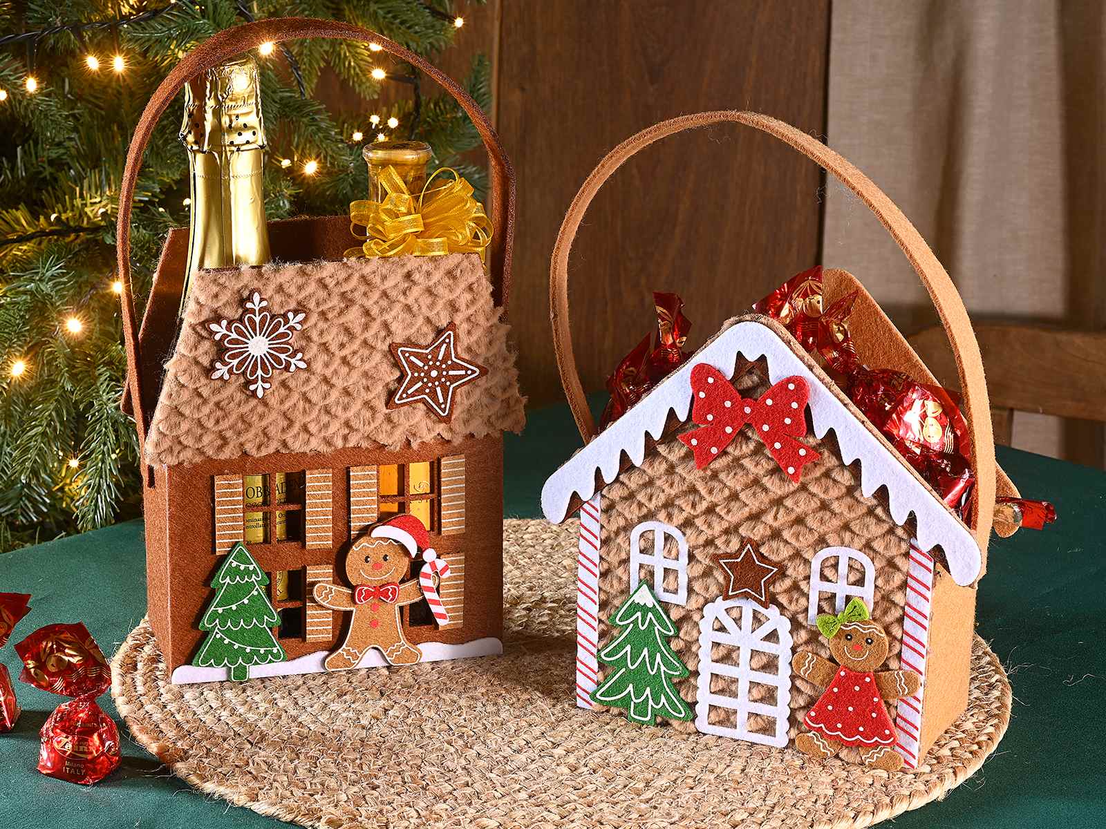 Bolsas de tela navideñas con forma de casita de jengibre, decoradas con motivos en relieve de copos de nieve, hombres, árboles y dulces.