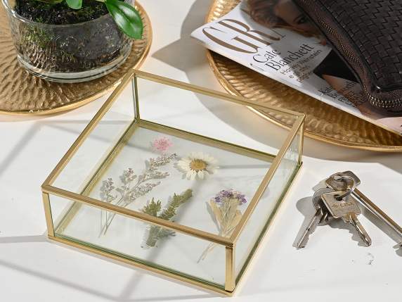 Bolsillo vacío de vidrio con flores secas y bordes dorados.