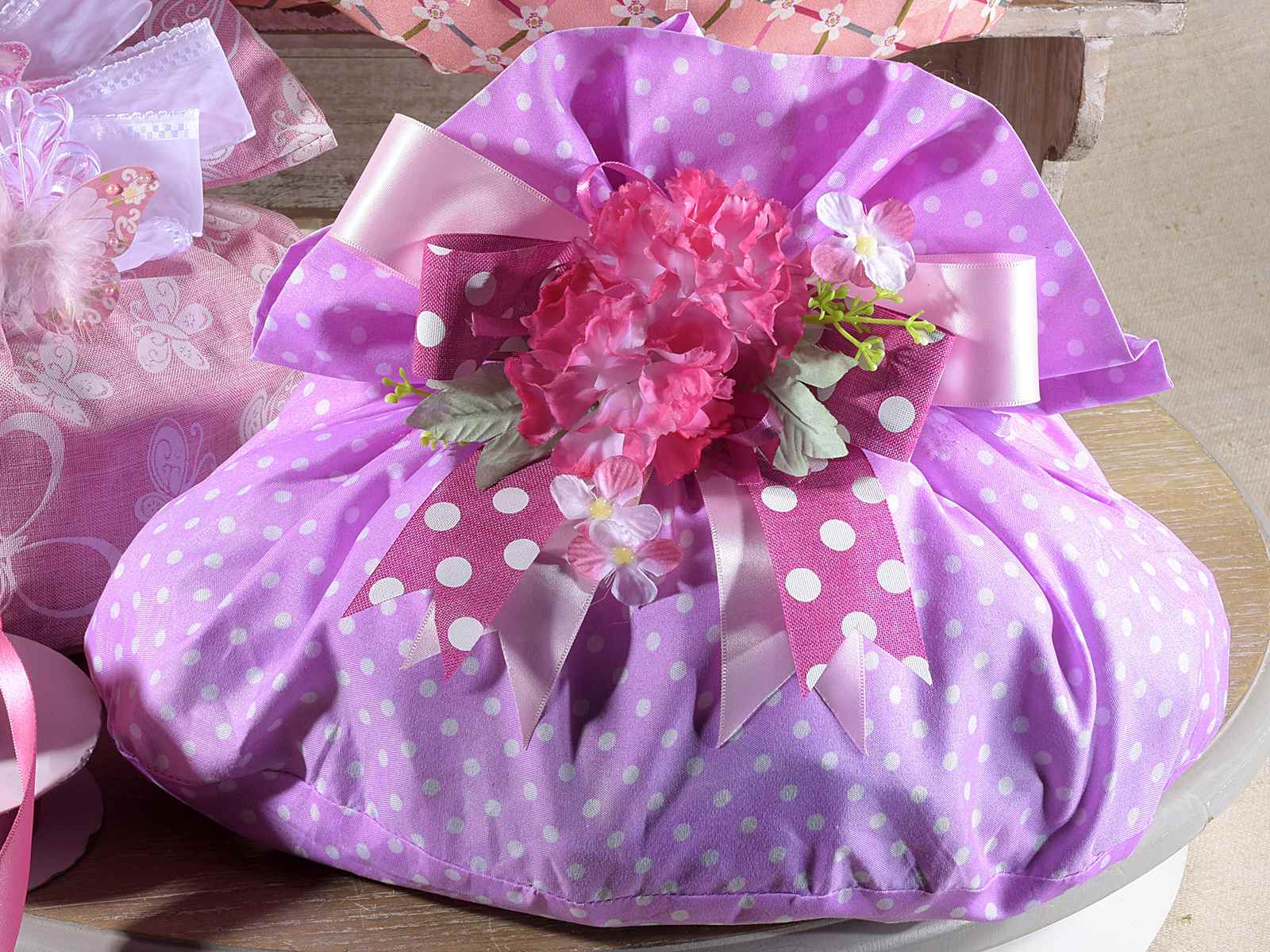 Bolsas de tela con lunares morados, rosas, amarillos, verdes, azules y rojos con cordón