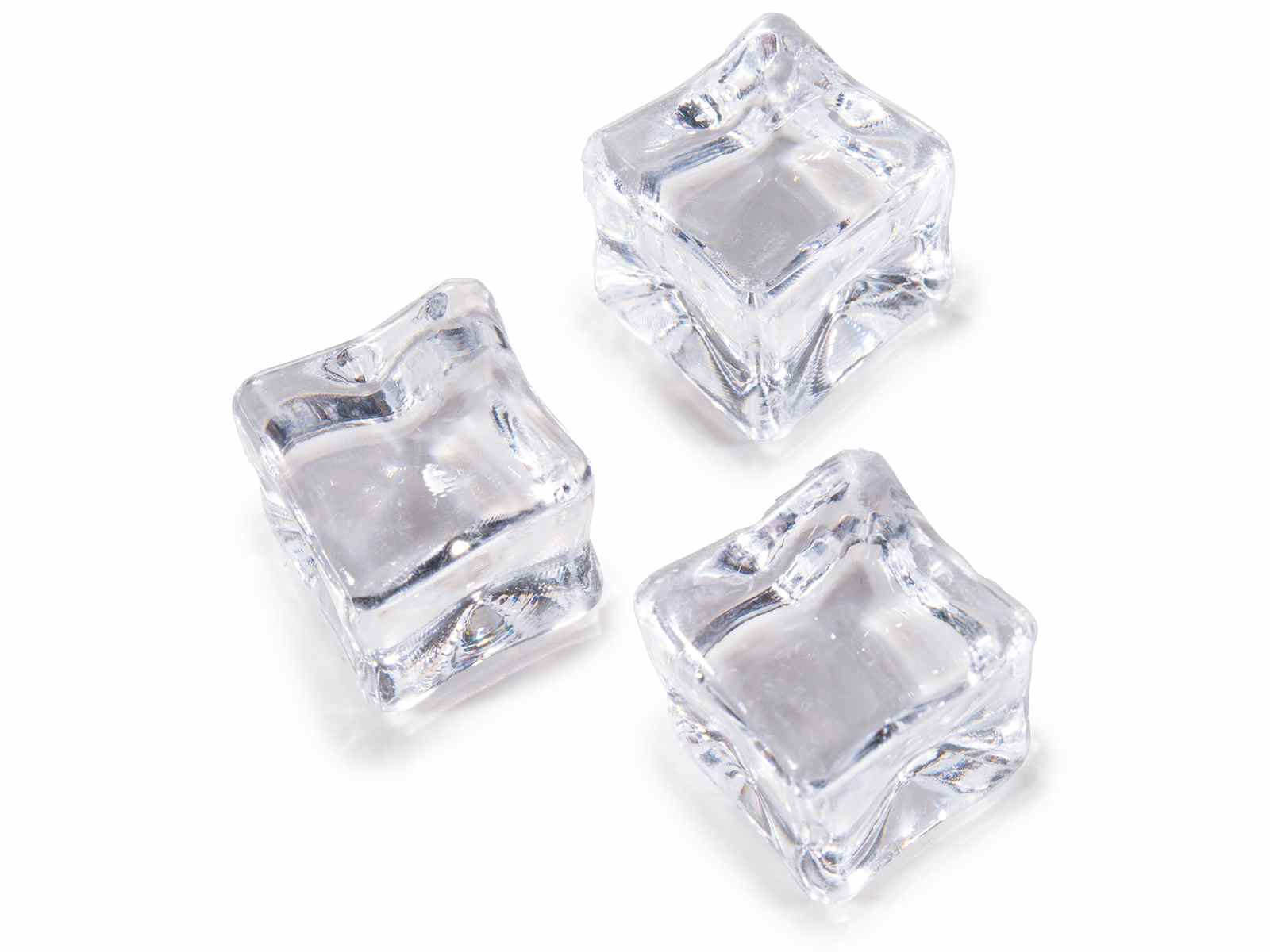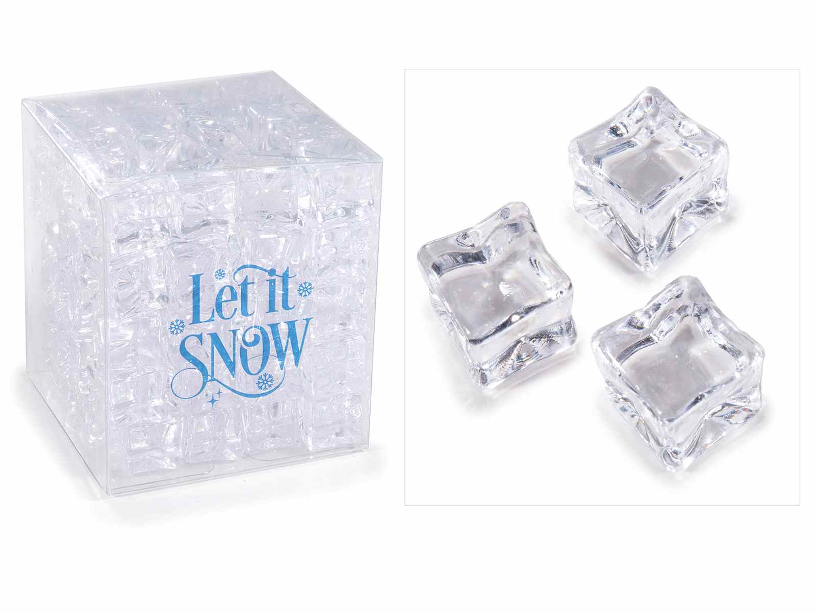 Cubitos de hielo artificiales transparentes decorativos en caja de 80 unidades. Perfectos para escaparates navideños, decoraciones festivas, centros de mesa y arreglos escénicos. Ideales para crear efectos realistas.