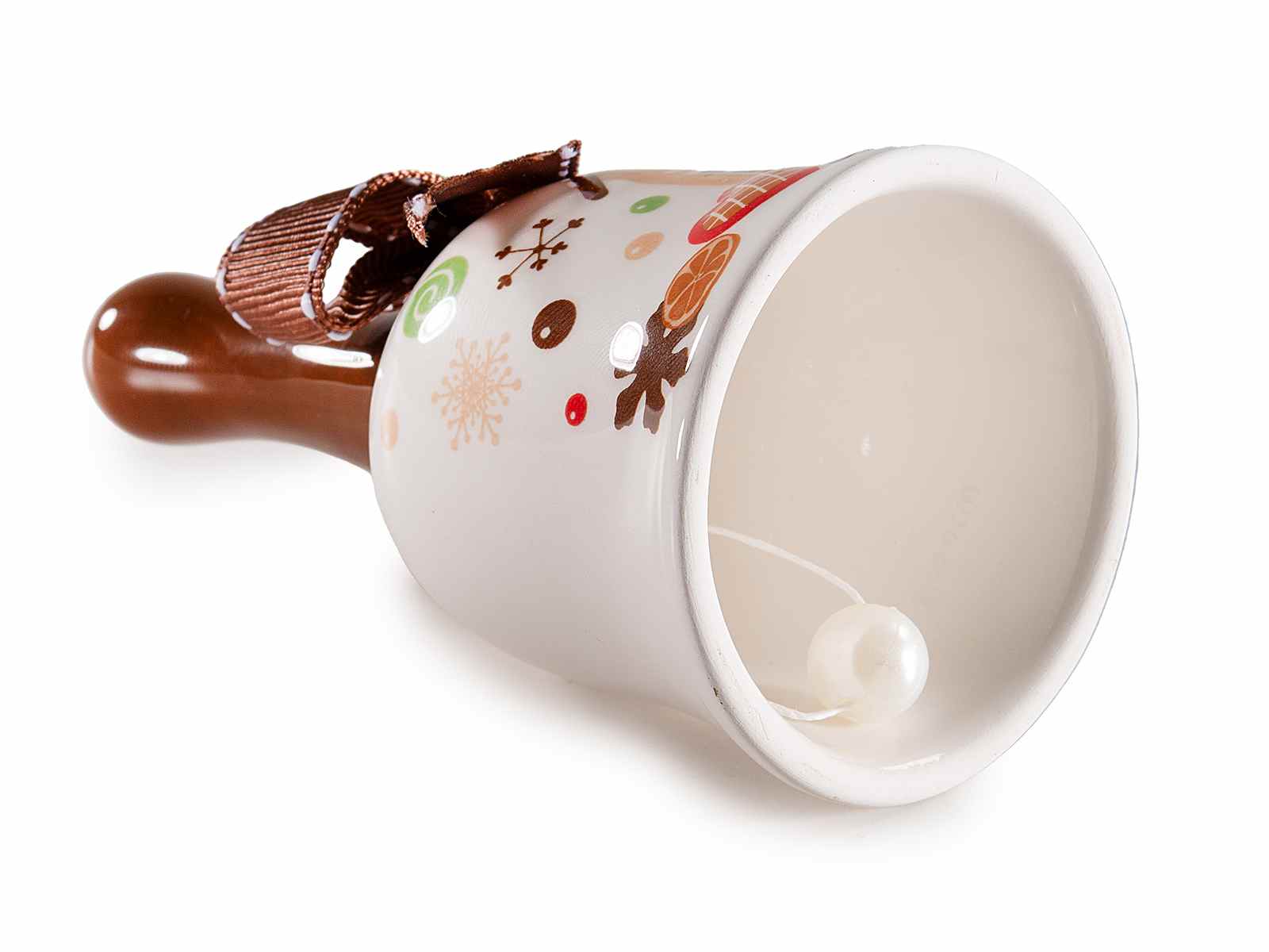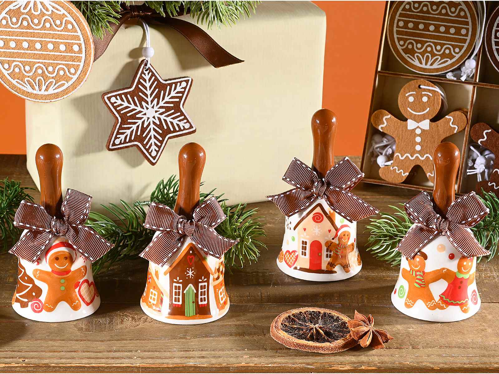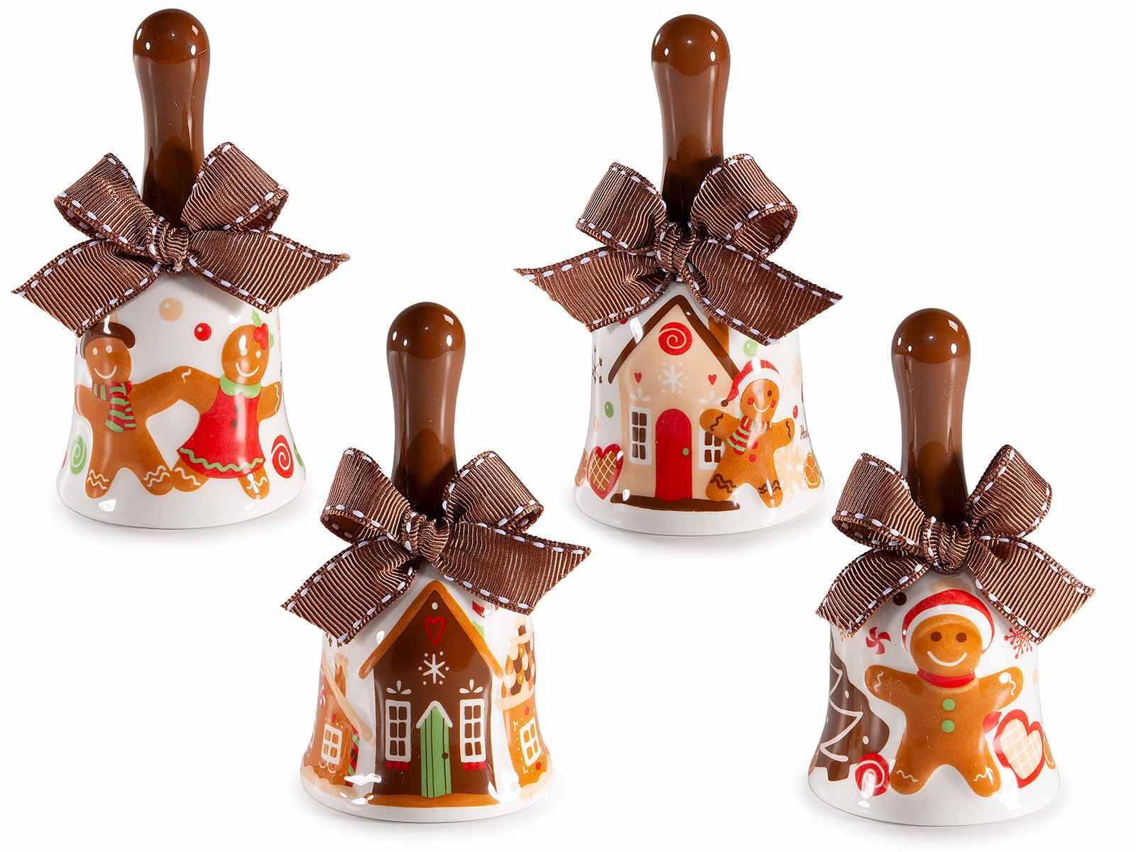 Campanas navideñas de cerámica con lazo y adornos de hombrecito de jengibre