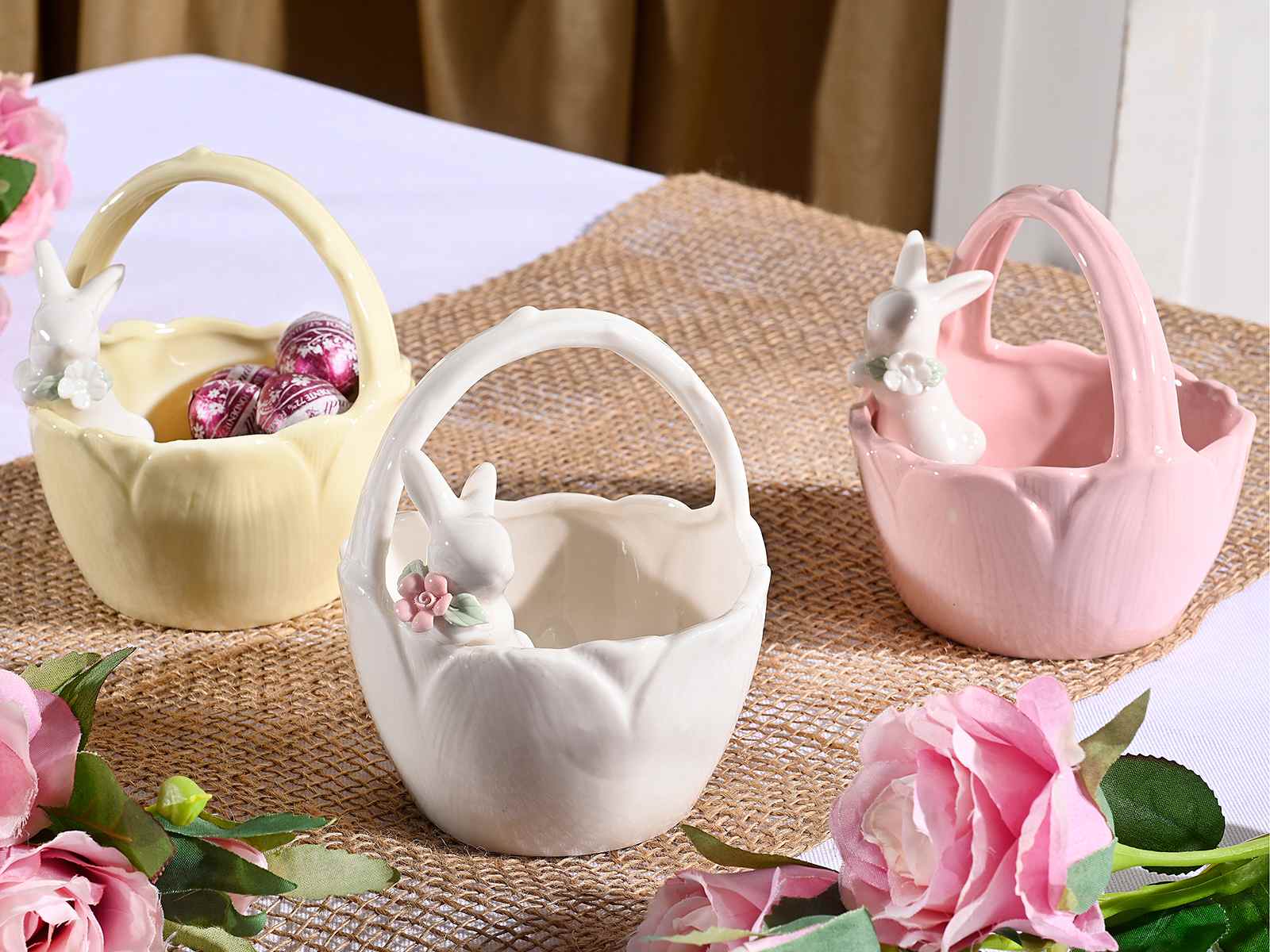 Cestas de Pascua en porcelana de colores brillantes con un conejito y una flor decorativos.