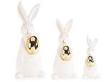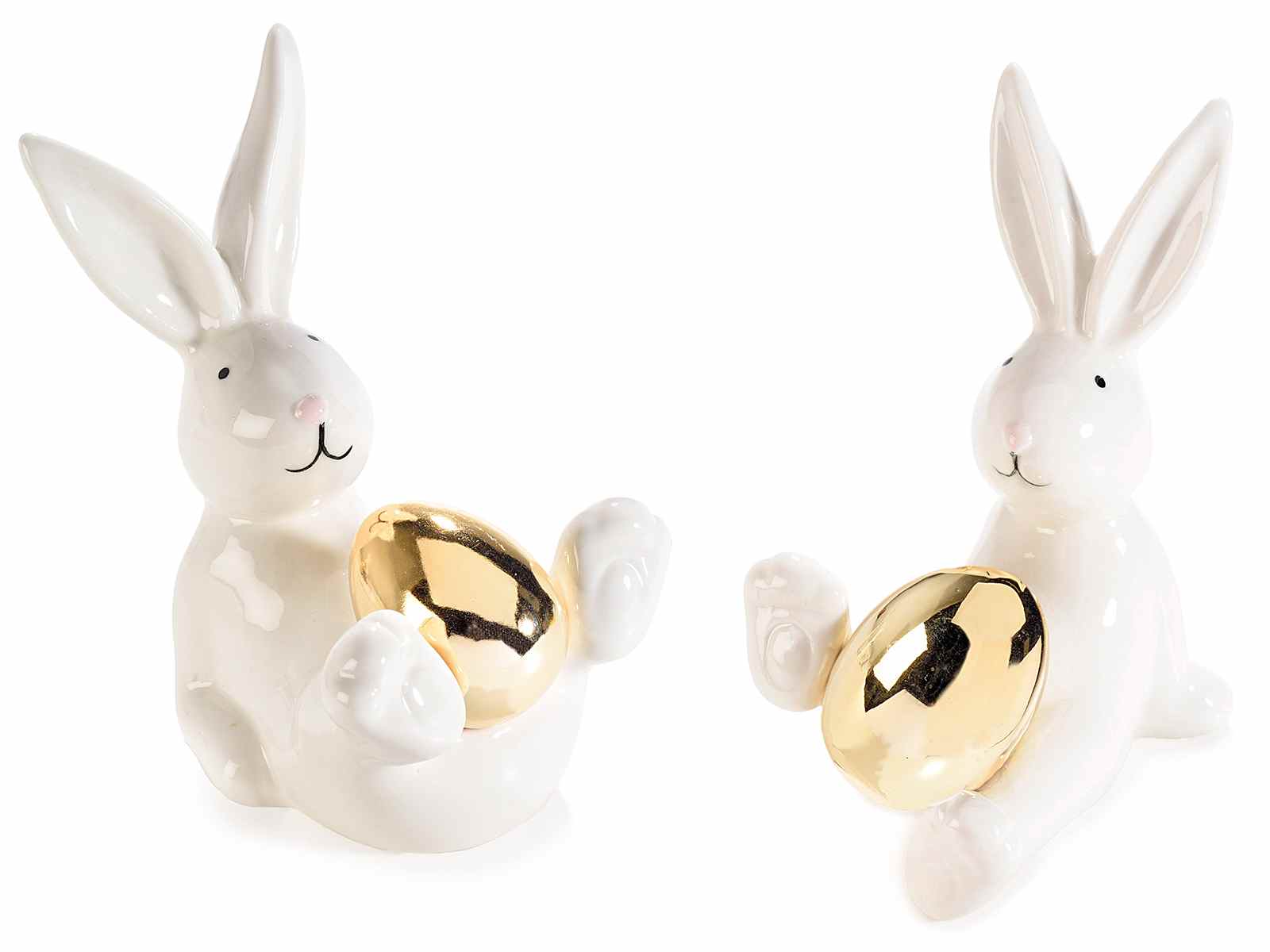 Elegantes conejitos de Pascua decorativos de cerámica tumbados con huevo dorado brillante