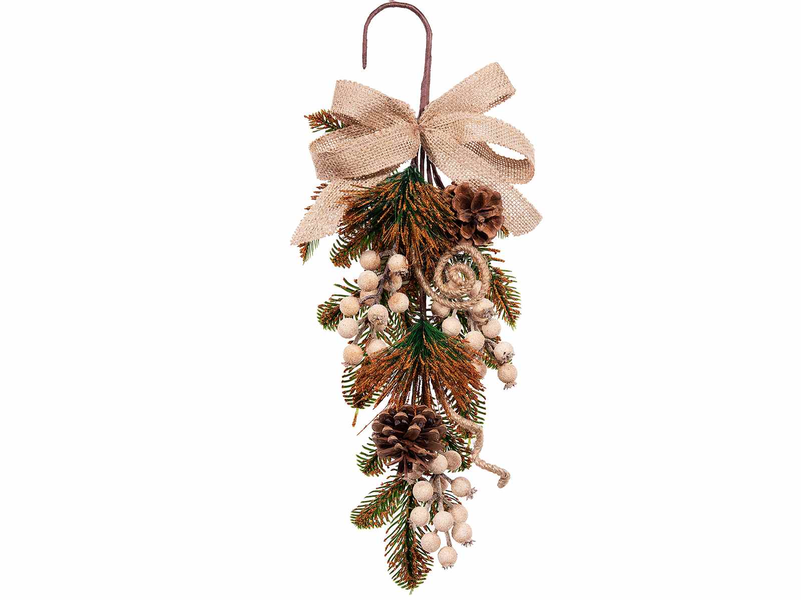 Corona colgante con piñas, bayas y lazo de yute.