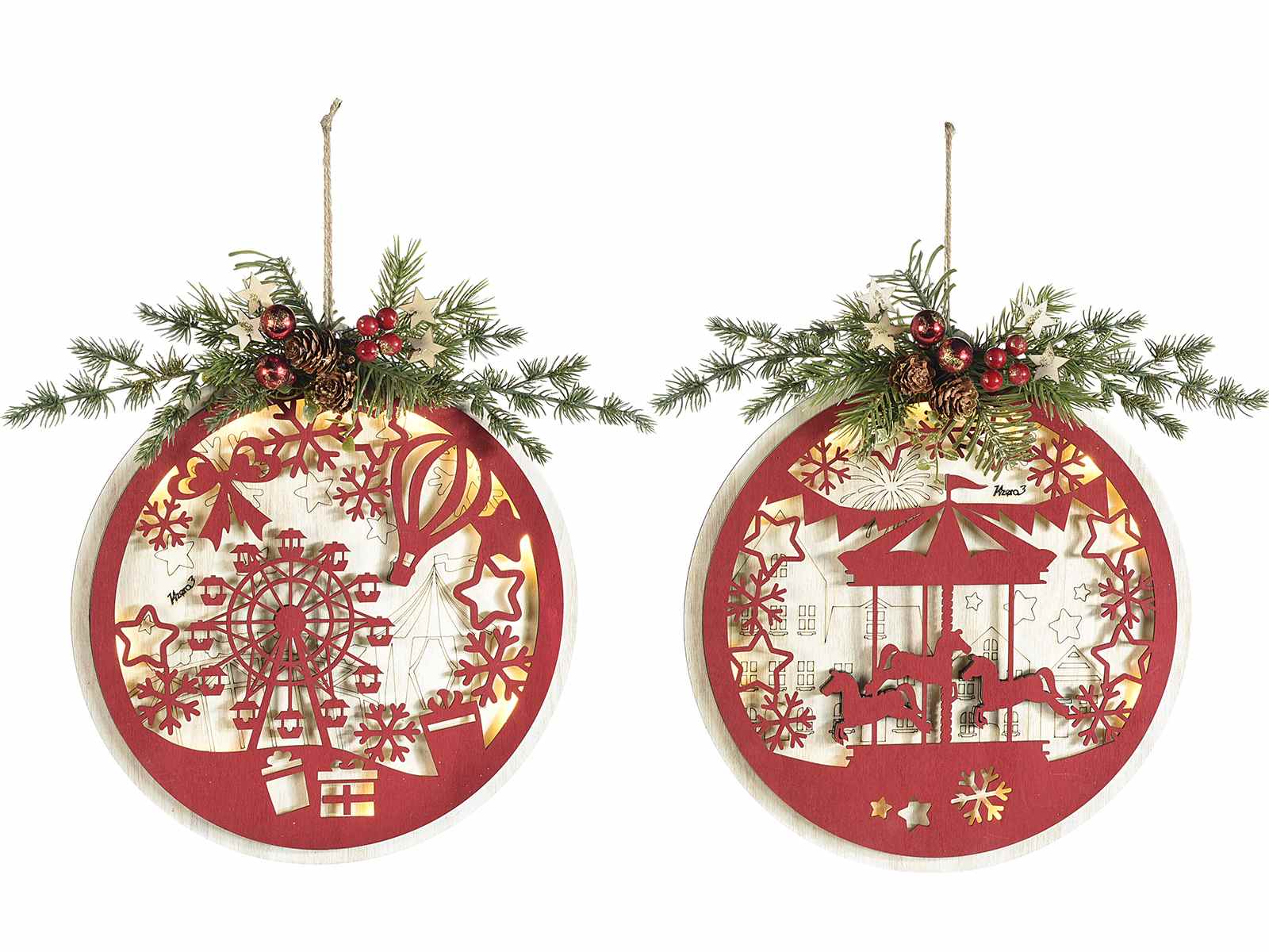 Cuadro navideño de madera con luces LED para colgar. Decorado con escenas talladas que representan una noria y un carrusel, enriquecido con ramas de pino, bayas y mini bolas navideñas.