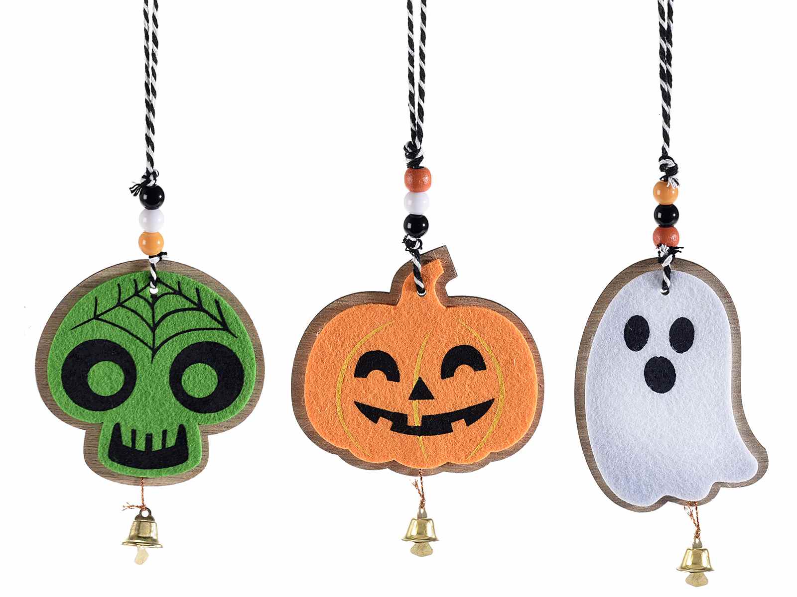 Adornos de Halloween con fantasma, calabaza y calavera en madera y tela para colgar y cascabel