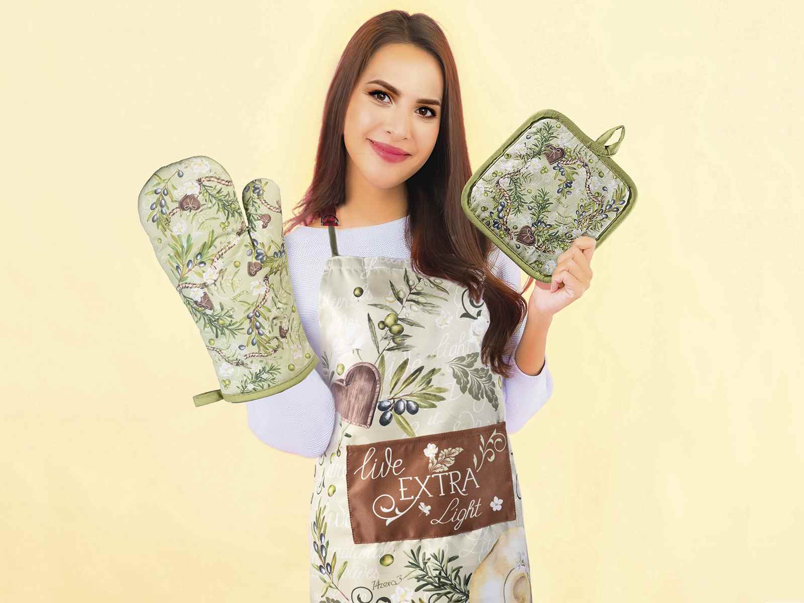 Delantal de cocina de tela con estampado de oliva y bolsillo