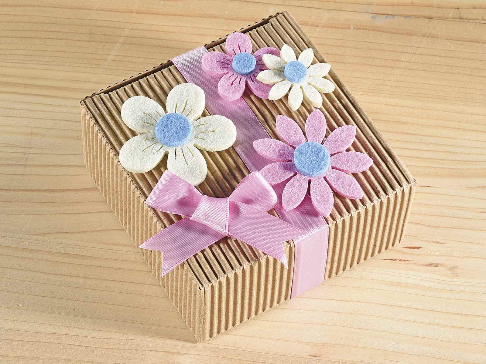 Flores en tela blanca y morada con adhesivo de doble cara en expositor