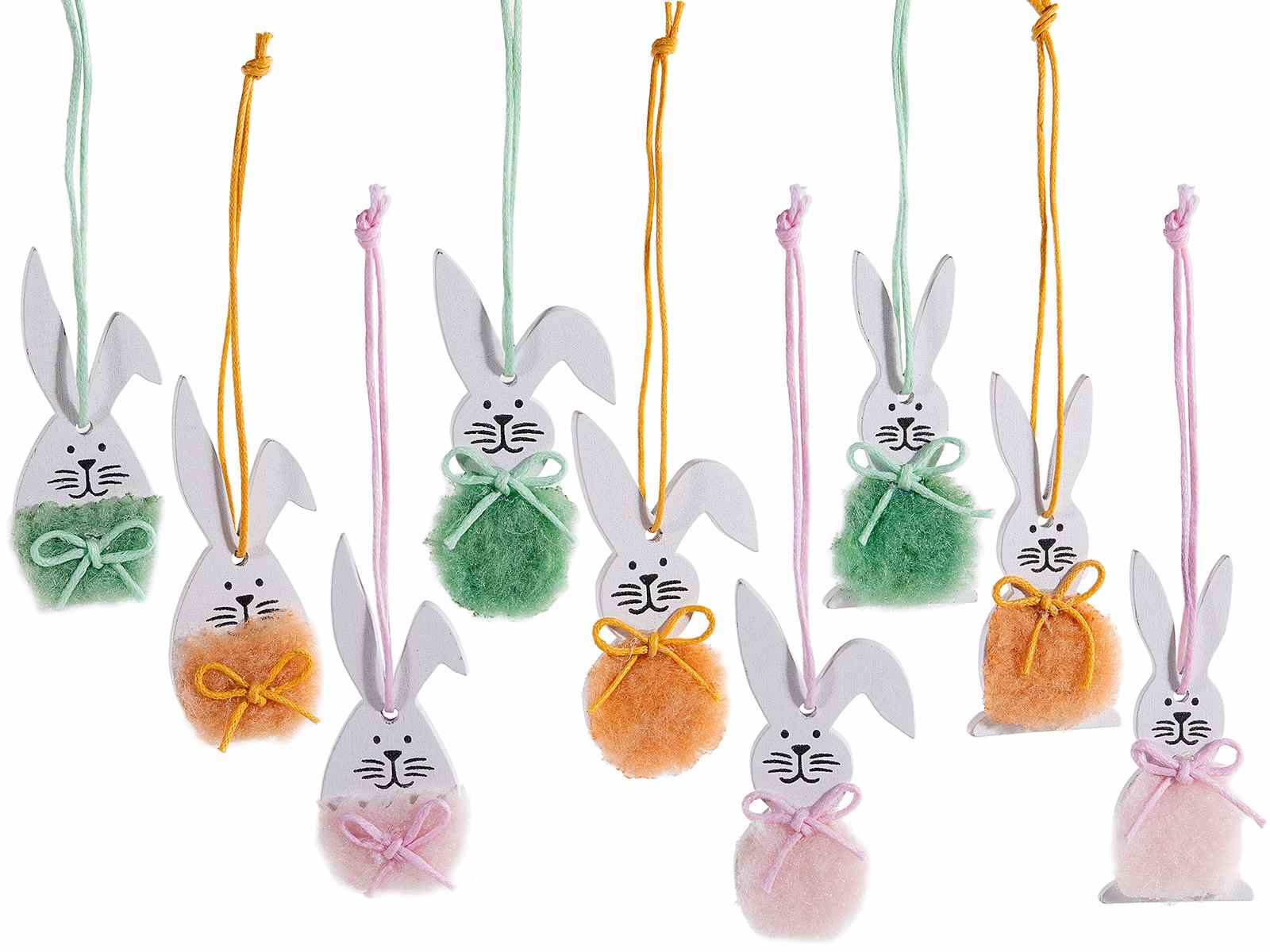 Adornos de conejitos de Pascua para colgar en madera de colores en expositor de 72 piezas