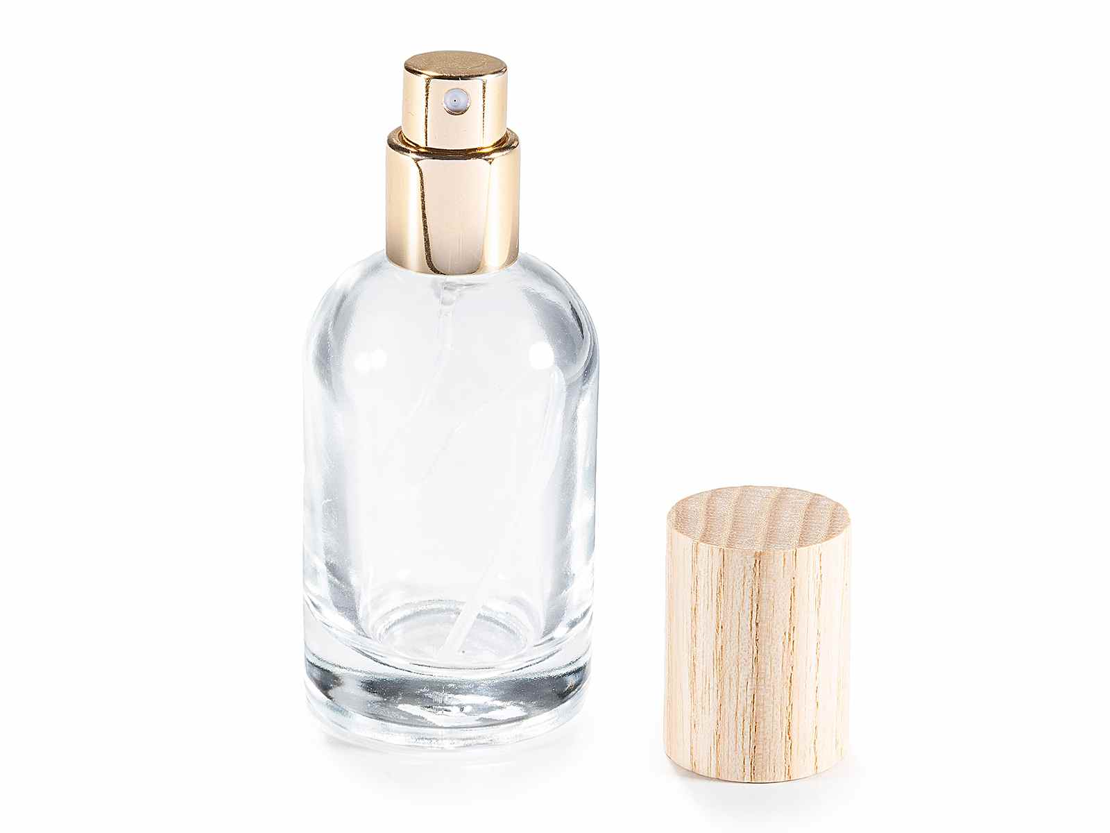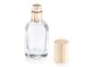 Frasco de perfume de vidrio transparente de 30 ml con dispensador de vaporizador dorado y tapa de madera.