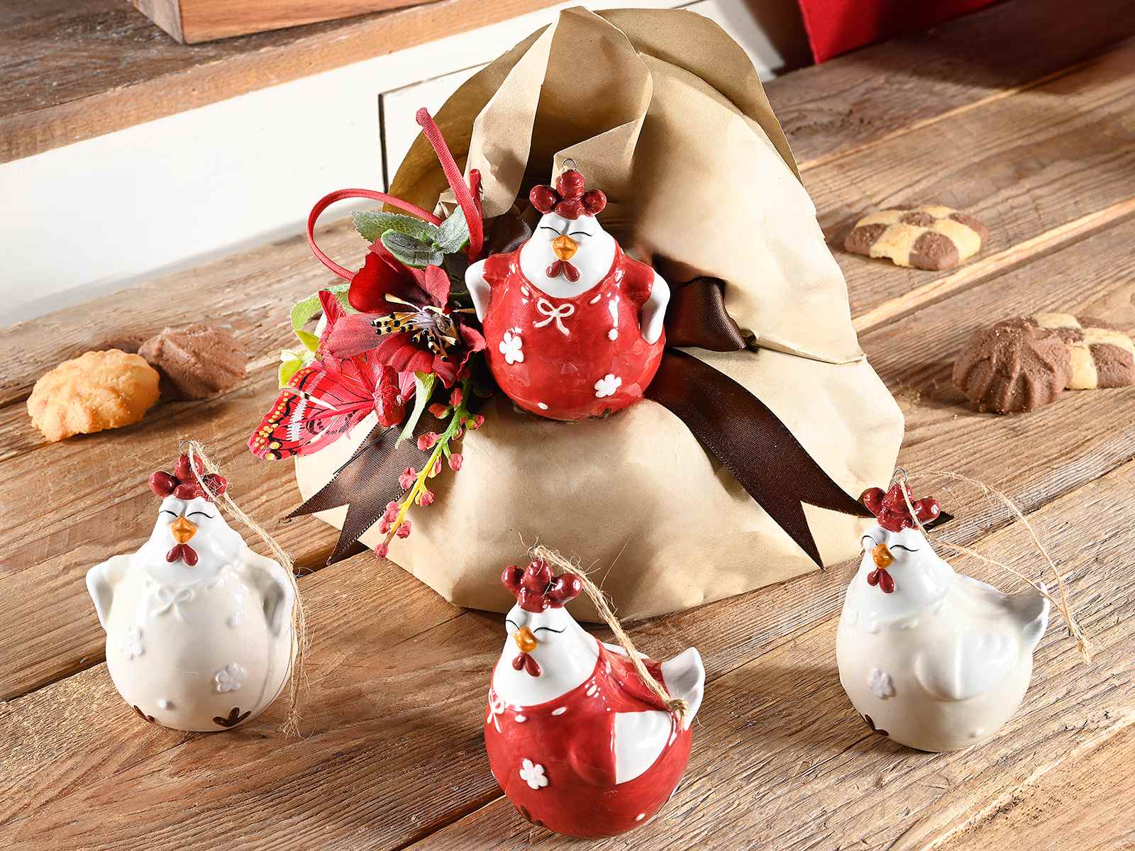 Gallinas decorativas de Pascua para colgar, de cerámica brillante, coloreada y decorada.