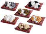 Gatitos decorativos de piel sintética durmiendo en una cama para perros de tartán.