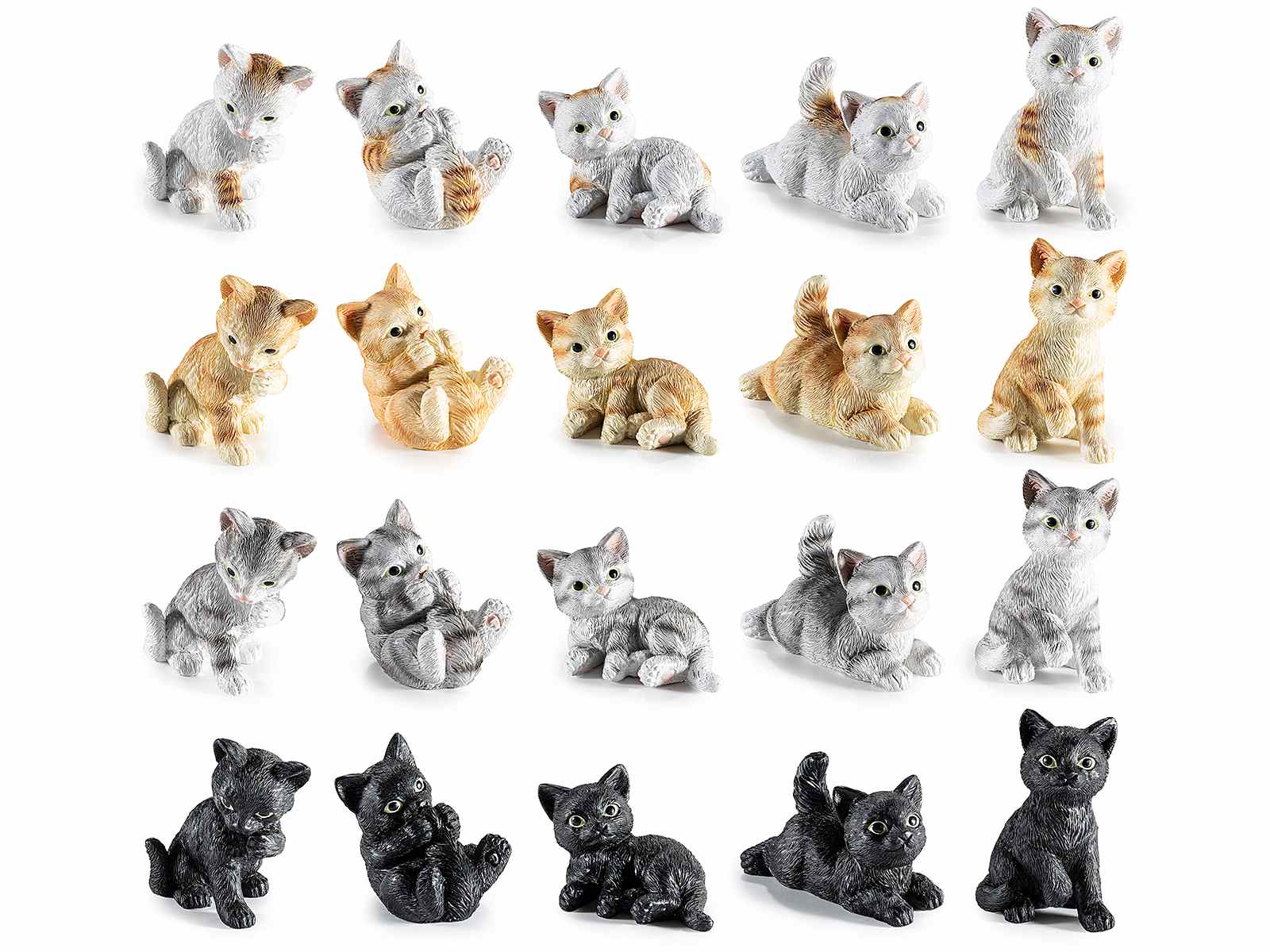 Miniaturas de gatos de resina de aspecto realista en varias posiciones, detalladas y disponibles en varios colores.