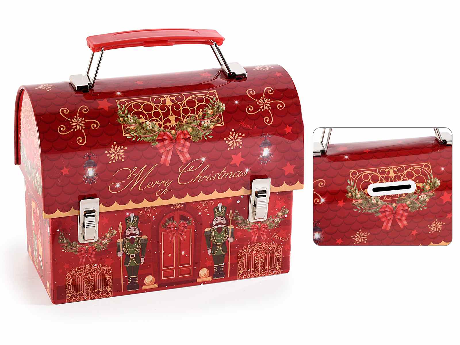 Huchas navideñas en forma de maleta metálica decoradas con motivos de casas navideñas y la frase Feliz Navidad
