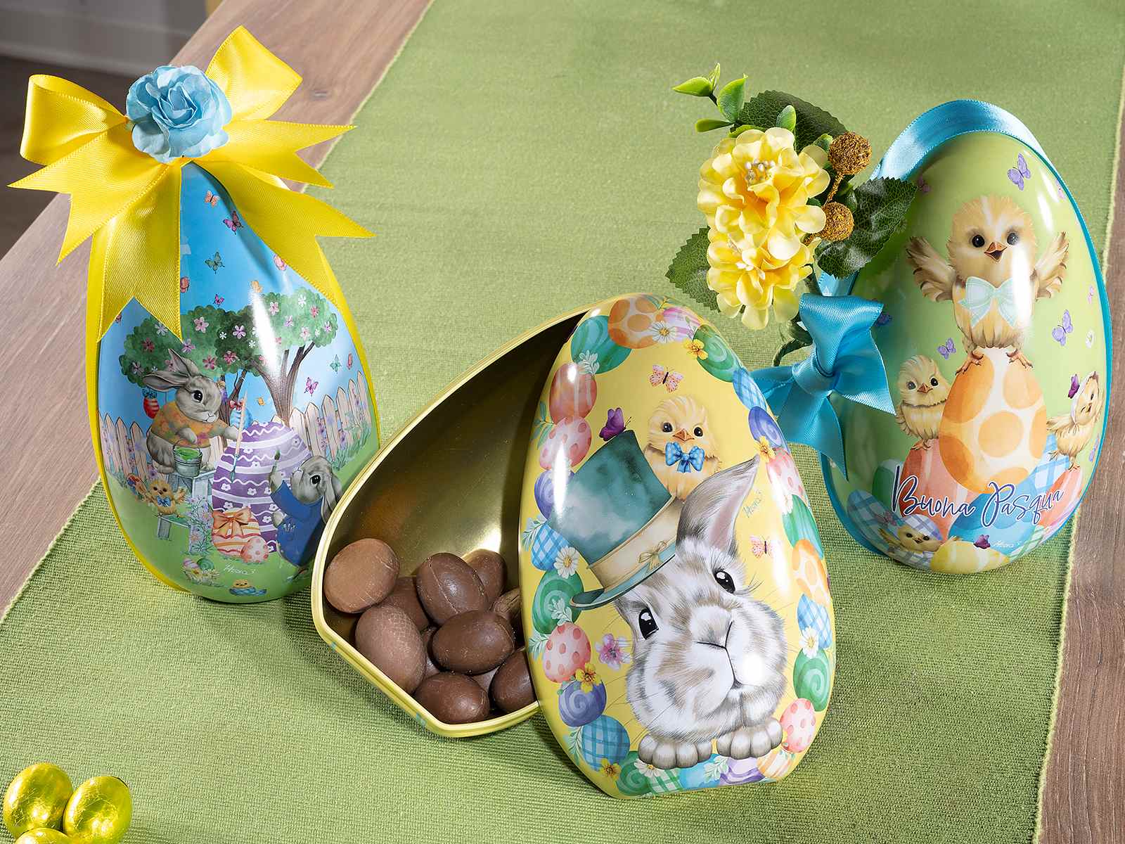 Huevo de metal apto para uso alimentario, con diseño de conejo y pollito de Pascua. Perfecto para envolver huevos de Pascua y dulces.
