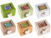 Caja con 6 infusiones de 40g cada una en caja de madera coloreada para té/especias, con cristal transparente y colgante blanco en forma de corazón.