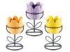 Jarrones de cerámica de colores con forma de tulipán sobre una base de tallo de metal.