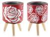 Jarrones de cemento sobre trípode de madera con decoración de rosas blancas