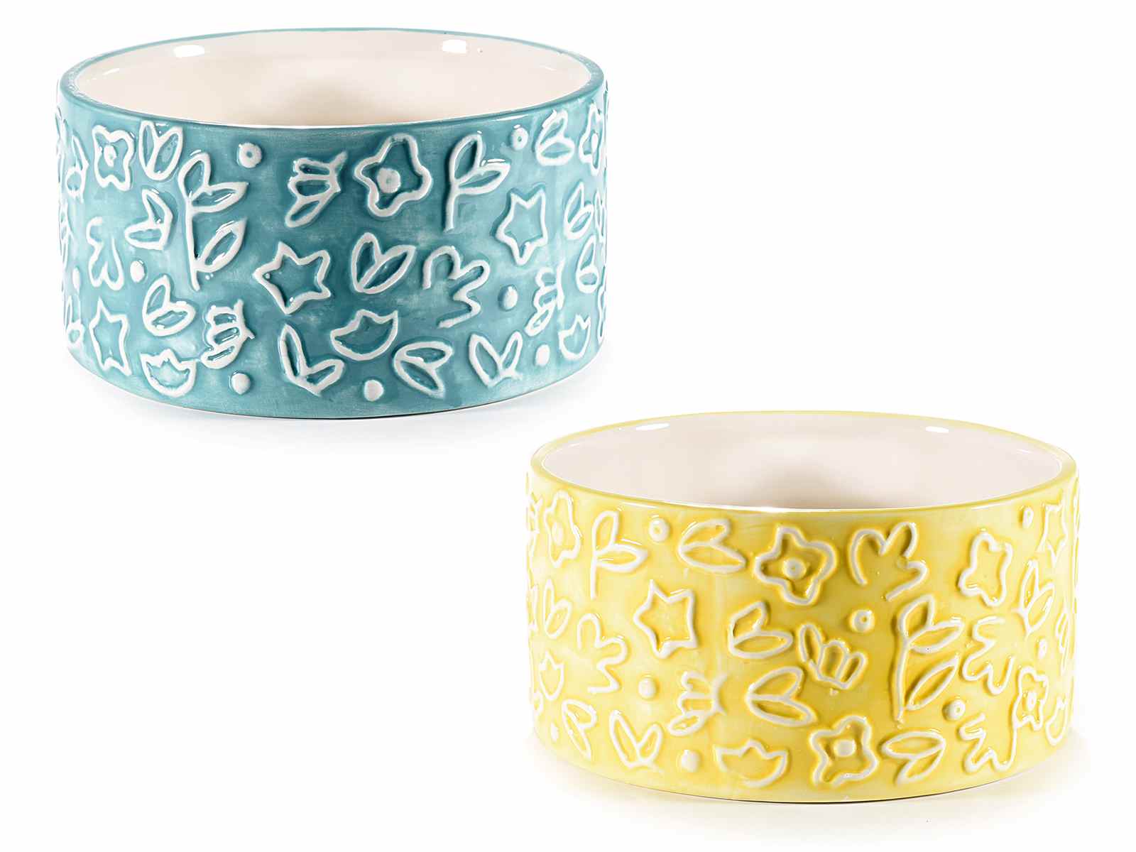 Jarrones de cerámica redondos de colores con decoraciones florales blancas en relieve.