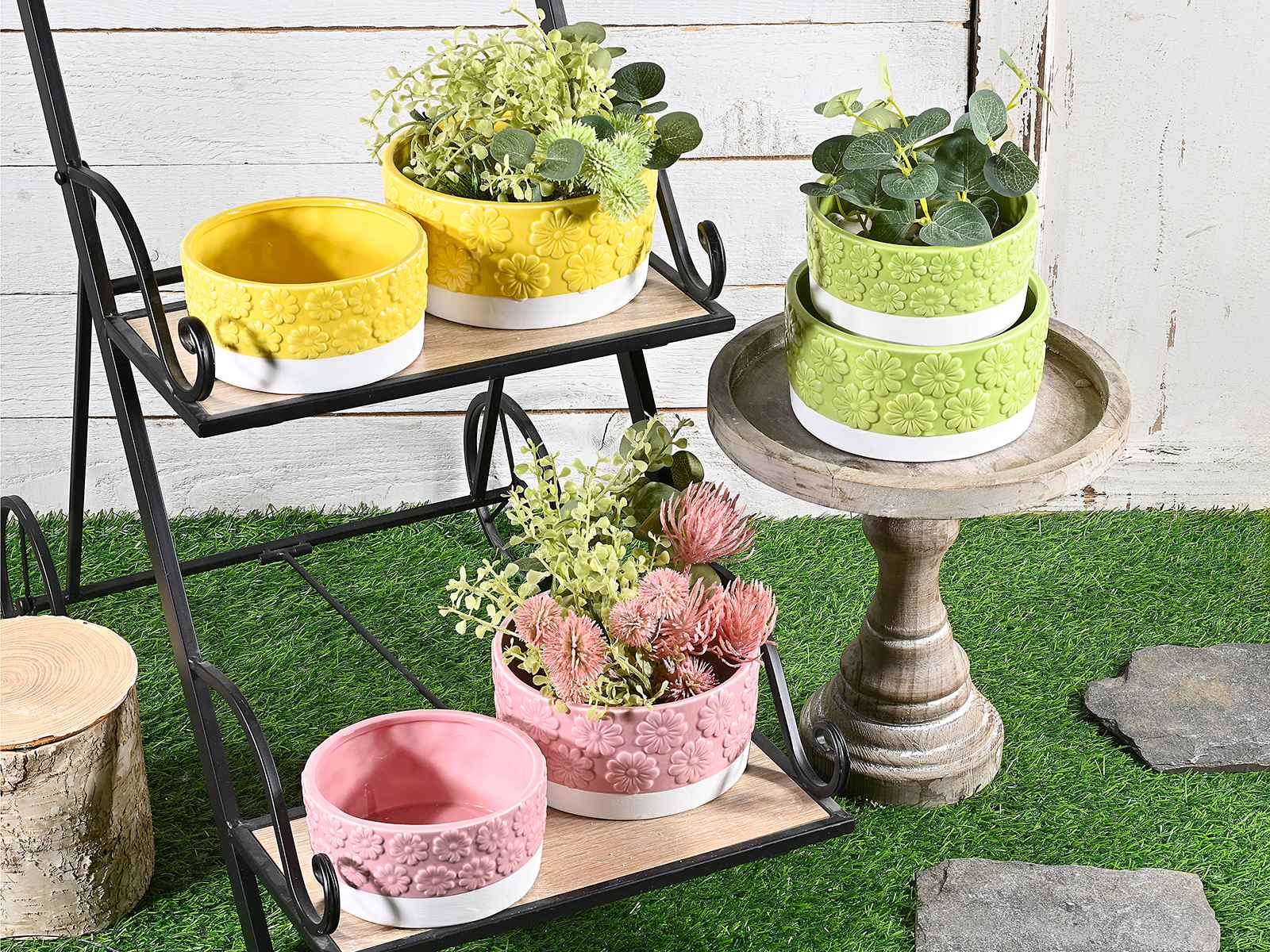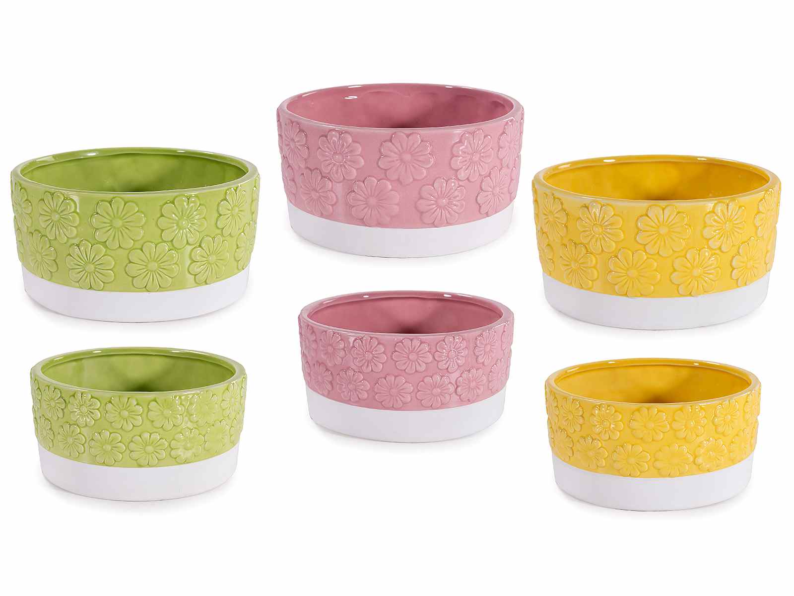 Jarrones de cerámica de colores con flores en relieve en juego de dos piezas.